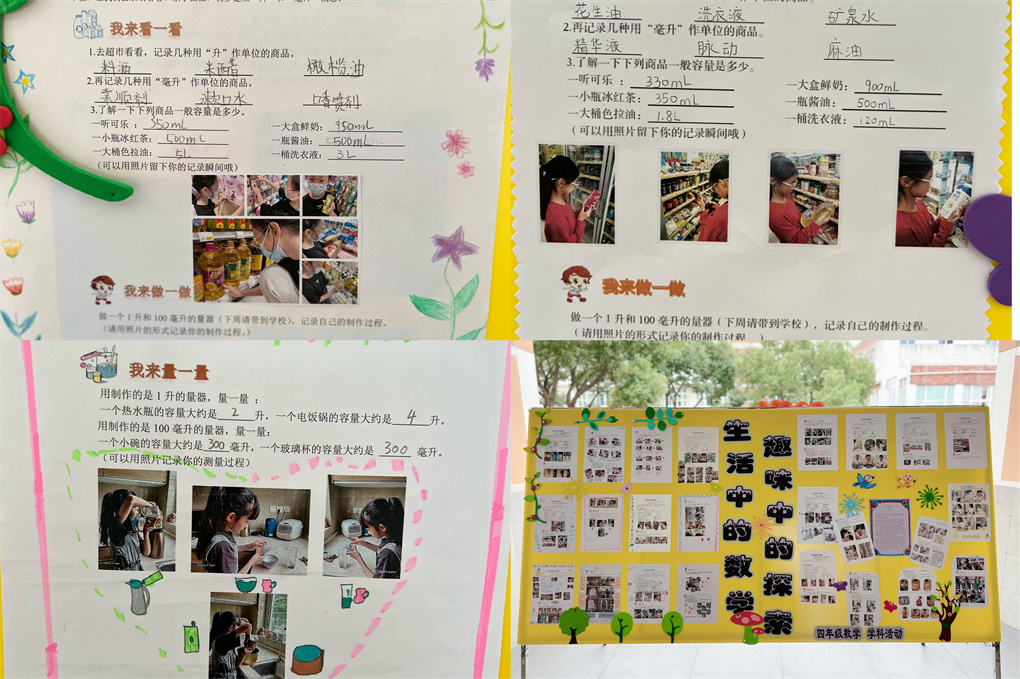 数学是一门与学生的生活息息相关的学科,数学与生活的联系十分密切,在我们的日常生活中包括着很多数学问题。本次国庆长假,四年级数学组开展了一次关于《升和毫升》的单元综合实践活动。在本次实践活动中,同学们充分利用假期,来到超市、来到菜场查找“升和毫升”的相关标识,在家中测量、找寻、制作“升和毫升”的量器。在生活中温习、巩固所学的数学知识,在学习与实践中感受数学学习的快乐。