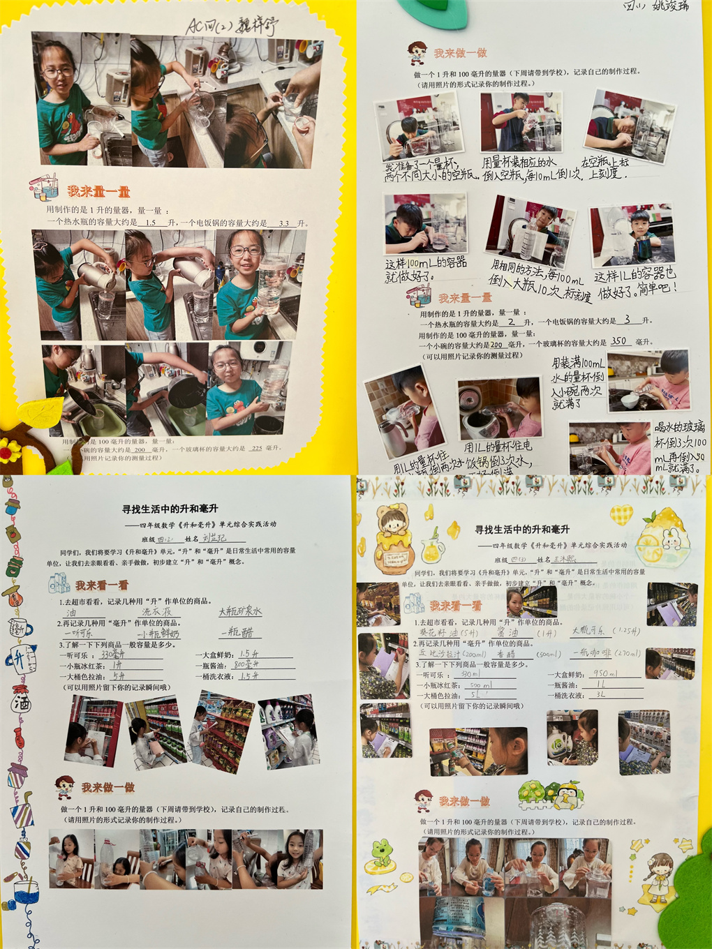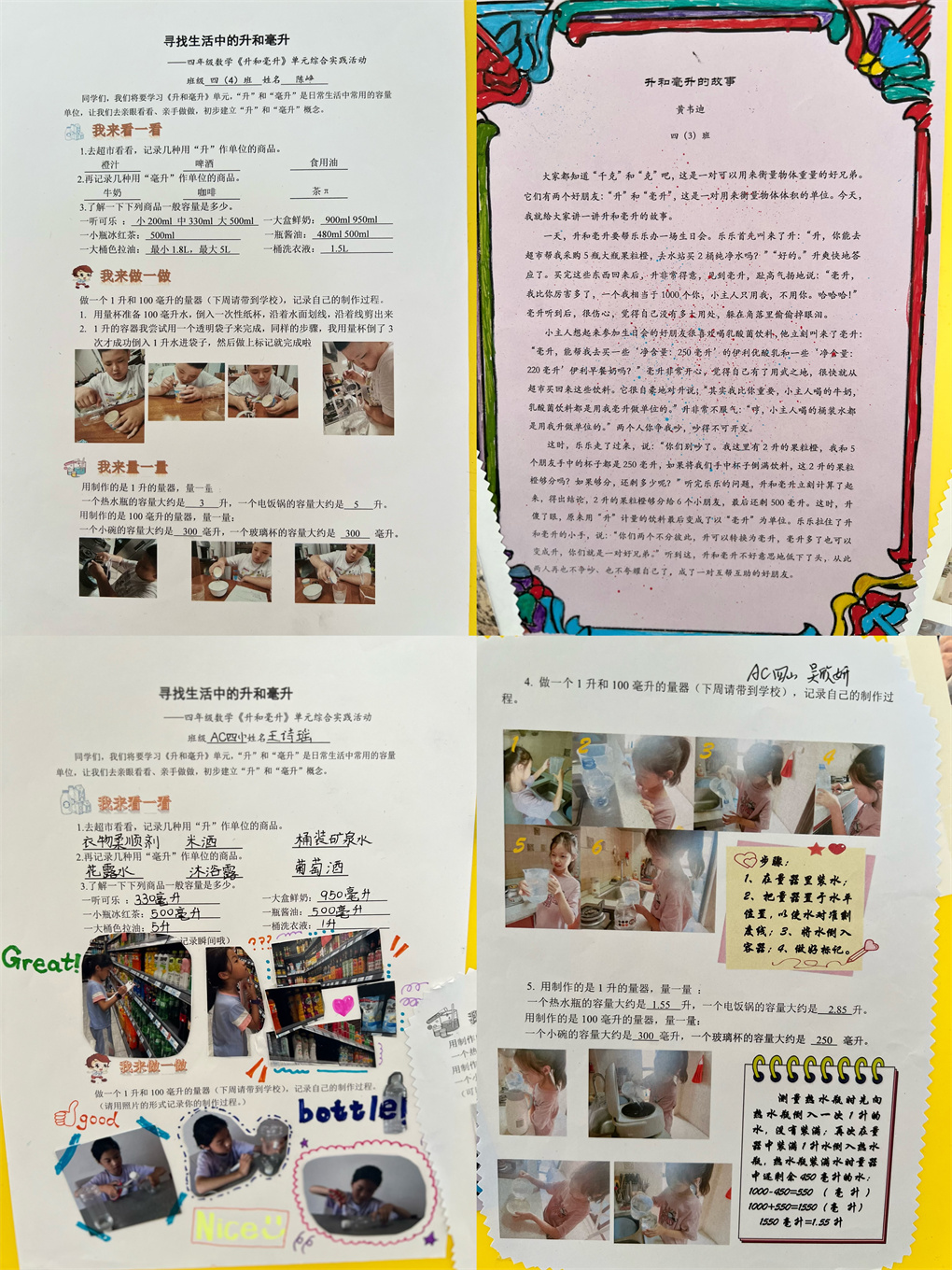 “升和毫升”是四年级的一个重点知识点,这个章节的知识点内容在我们的生活中随处可见,本次年级组专门配合本单元设计了一份实践类作业,学生以图文并茂的形式加以完成,他们来到超市将以“升和毫升”为单位计量的商品找出来,并进行记录。比如:桶装农夫山泉4升,大豆油5升,雪碧500毫升,香醋550毫升……在家中,学生们做了一个1升和100毫升的量器,制作过程中他们找来废旧的塑料瓶子,通过准确严谨的测量加以制作完成,量器制作完成后,学生对家中的一些用具进行测量,比如用1升的量器,测量出一个热水瓶的容量大约是2升,一个电饭锅的容量大约是2.5升,用制作的100毫升的量器,测量出一个小碗的容量大约是250毫升,一个玻璃杯的容量大约是200毫升。
