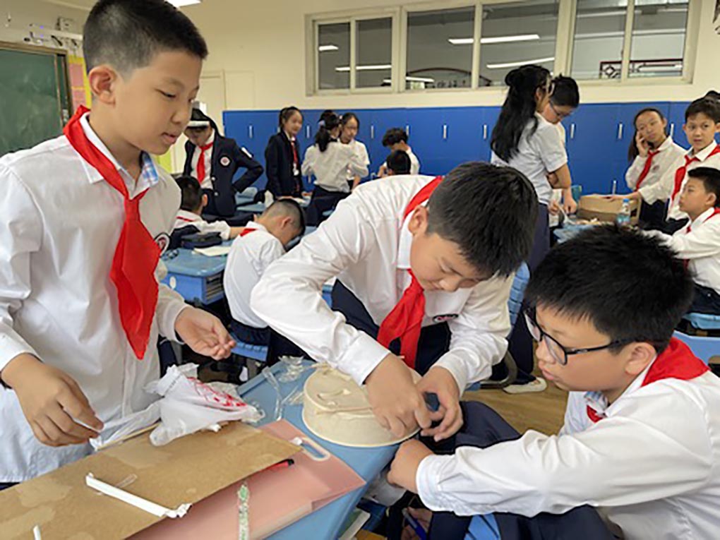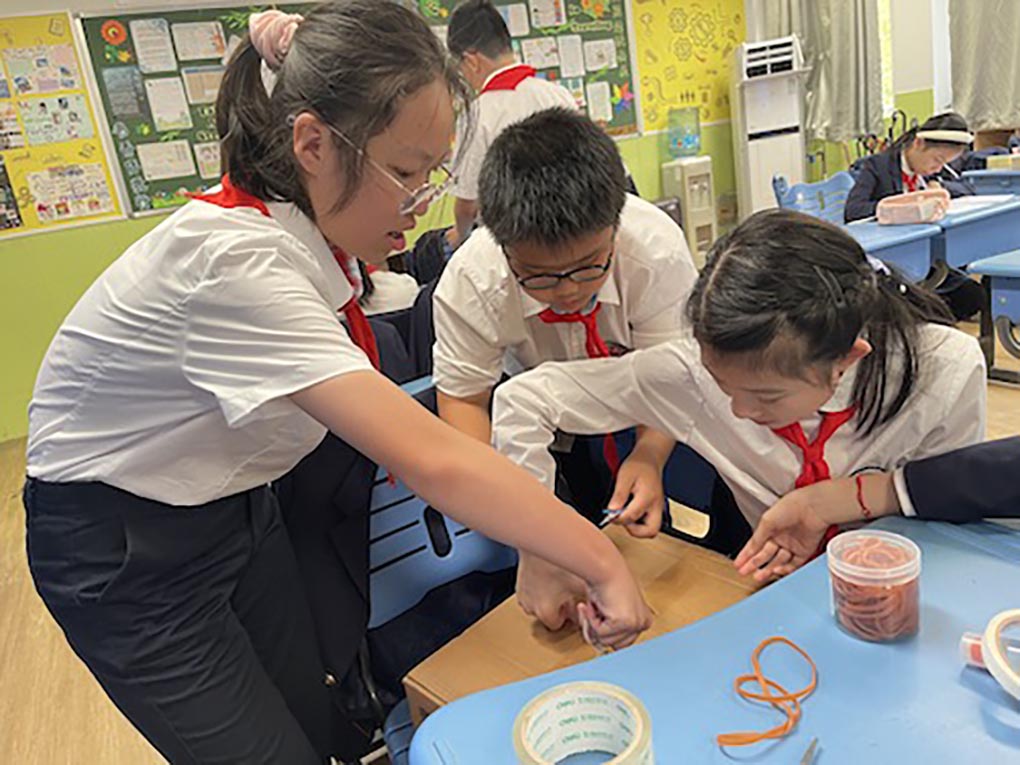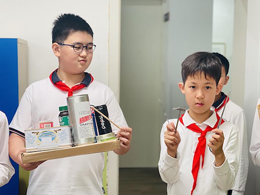 在“sounds and rhythm”这个主题的课程学习中,孩子们自己创造性地制作了乐器。这种有趣而有益的体验,在AC课堂中得以实践。孩子们首先研究学习各种类型的乐器,它们的独特特征,以及它们产生的声音。从传统乐器到现代创新,孩子们发现了音乐的丰富多样性。开始创意DIY之旅的孩子们,在制作自己小组乐器时发挥了无尽的创造力:寻找材料自制水瓶木琴,橡皮筋吉他,纸盘手鼓,竹子竖笛等等。如何能够通过改变乐器构造来改变声音的大小,孩子们不断地探讨。从纸质粘合的琴弦回归到传统的牛皮筋琴弦,孩子们尝试,失败,再尝试,直到成功,团队合作的和谐音符也在创作的过程中演奏着,和探索的乐趣相得益彰!