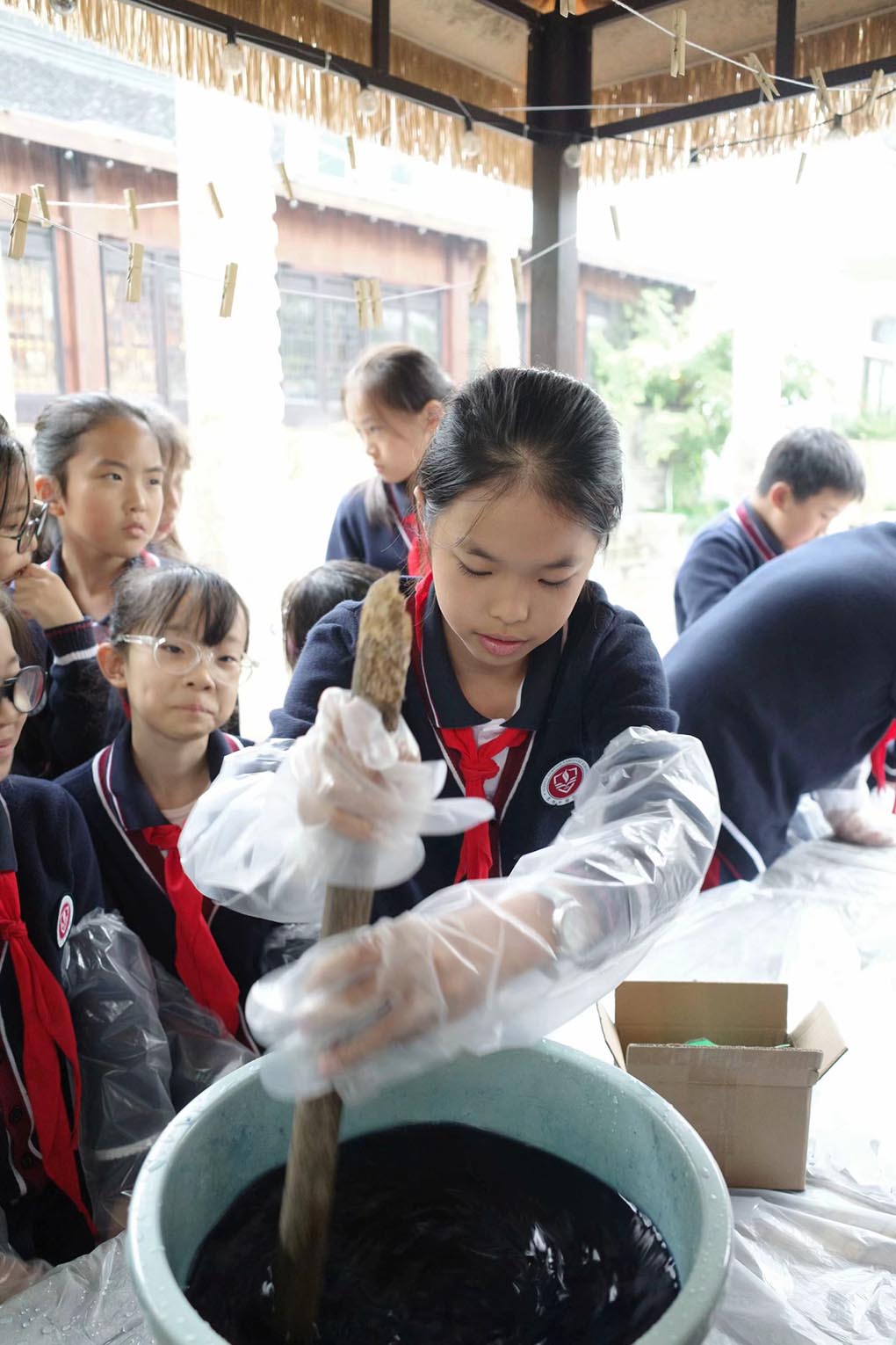此次活动在大家翘首企盼中开始。9日下午,学生们拿着外教老师专门为此次社会实践活动设计的实践问答卷,来到了诗酒田园民间手工作坊。在扎染小课堂上,老师绘声绘色地为孩子们讲解扎染文化,介绍非遗扎染技艺源远流长的历史和分类,并手把手地向大家传授扎染基本技艺。孩子们在老师的讲解下,对染布或扎或拔、又染又洗,圆形扎法、斜线扎法、米字法等扎法有了更多的了解。孩子们跃跃欲试,都迫不及待地想亲自动手制作一件扎染艺术品了。当他们得知每人都有机会动手制作带有苏外logo的扎染帆布包时都高兴坏了。在自己动手制作环节中,孩子们首先了解了扎染染料是板蓝根,染料搅拌时需要顺时针。然后,孩子们在老师的指导下将帆布包根据一定规律翻折捆扎。最后,孩子们将帆布包放入颜料桶进行浸泡。当一团团小布料从染锅中被捞起时,孩子们急切地拆掉线团展开布包,扎在晾晒绳上晾晒。帆布包的样子果然变了。扎起来的地方,出现了各式各样的花纹和图案。看着自己完成的创意作品像模像样,孩子们不禁心中得意洋洋!忐忑间解开自己的随手捏创意作品,虽然花纹效果比较粗糙,算不上是艺术品,但发现在自己不经意间竟呈现了一只展翅的蝴蝶、一朵娇艳的小花……大家觉得很有趣、很好玩。