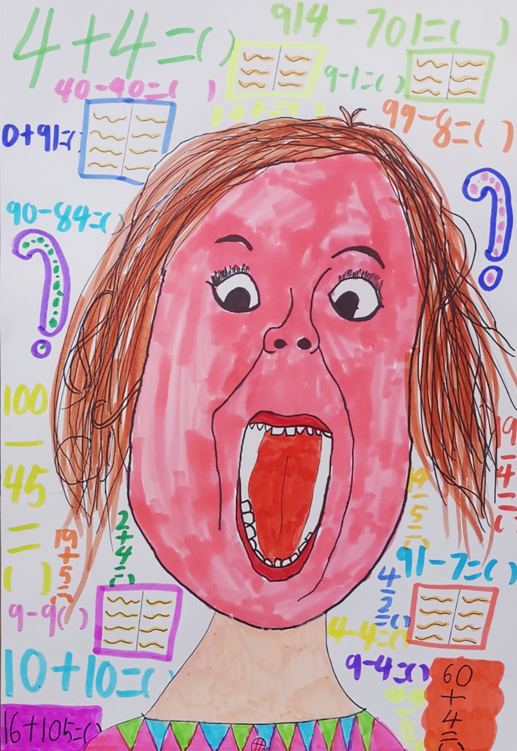 同学们在初尝了创意大爆发的肖像画练习后,又深入了解了人物的不同的夸张表情如何用画笔呈现出来,在学习了人物五官的基本构造后,大家通过手边各种夸张人物表情的摄影图片,自主创作了一幅具有情节性的夸张表情画。同学们不仅学会了画夸张表情,还学会了如何添画和主题有关的环境背景,画面更加丰富完整。