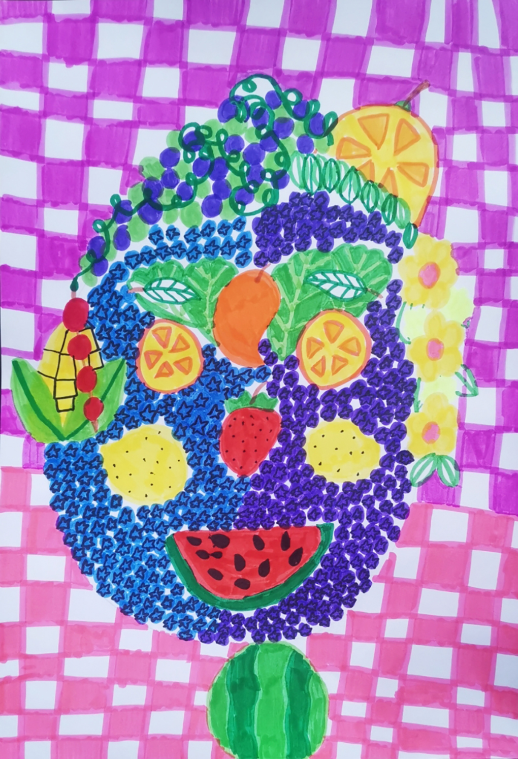 学期初,孩们学习欣赏了意大利文艺复兴时期的艺术家朱塞佩·阿尔钦博托的“春”“夏”“秋”“冬”系列的油画人像作品,惊叹于艺术家天马行空的脑洞,利用各种代表季节性的花卉蔬果密集组合成人物形象。孩子们也以此为灵感,尝试用植物元素来组合绘制一幅人物肖像画。