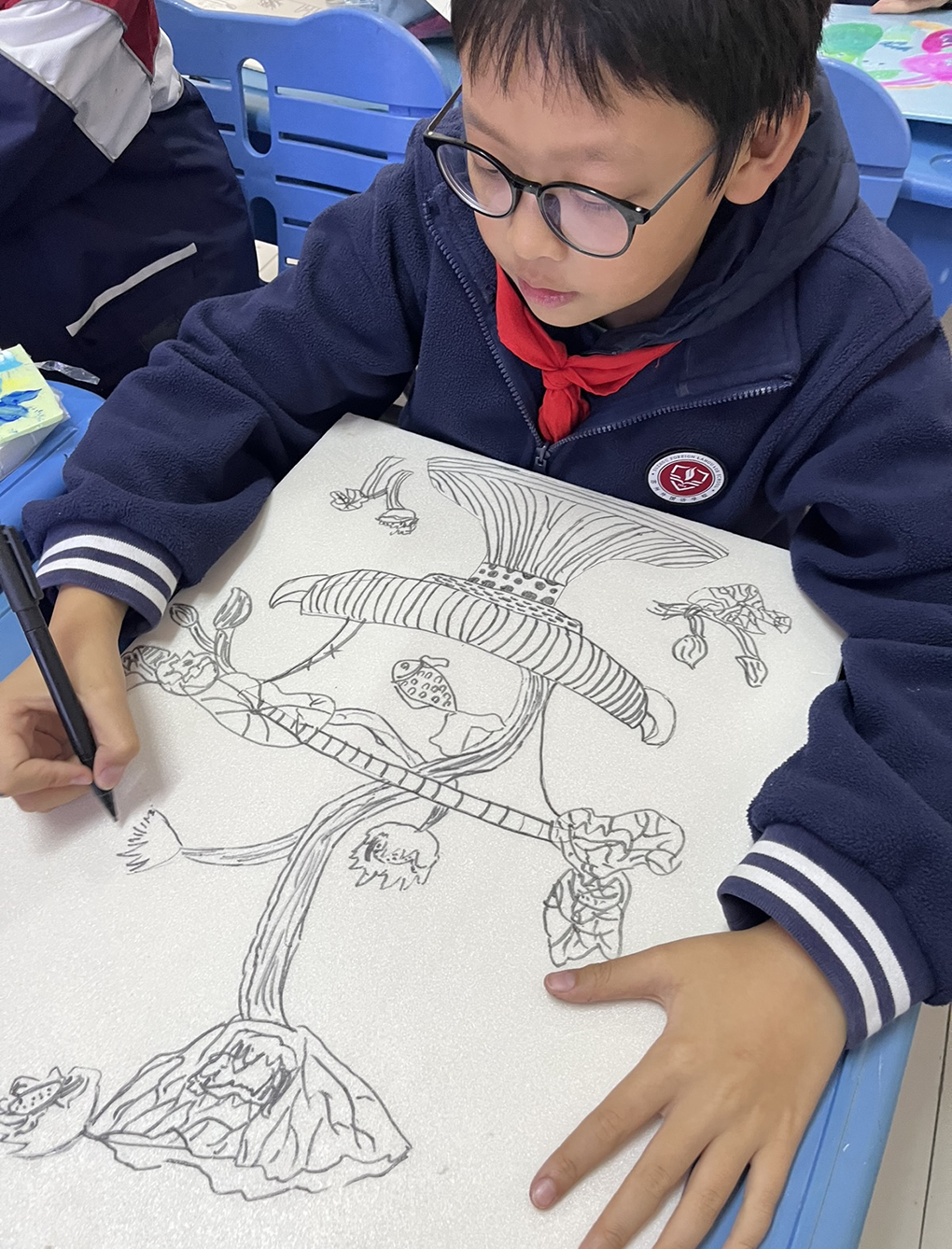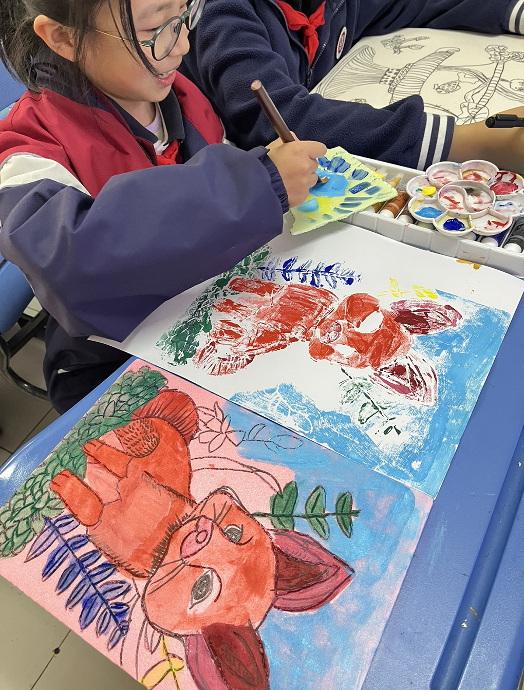 为落实“双减”政策,丰富学生的课余生活,发展学生个性,培养学生健康的兴趣和爱好,学校开设了卡通文创兴趣小组,让学生在艺术实践中发挥想象力与创造力,将传统艺术——粉印版画融入教学之中。版画种类较多,有木刻版画、石版画、铅版画、铜版画等,由于使用的工具、材料复杂而危险,技法繁多、要求较高,儿童不易掌握。所以儿童版画的教学是一个难点,为此为三四年级组学生创设了粉印版画课程。