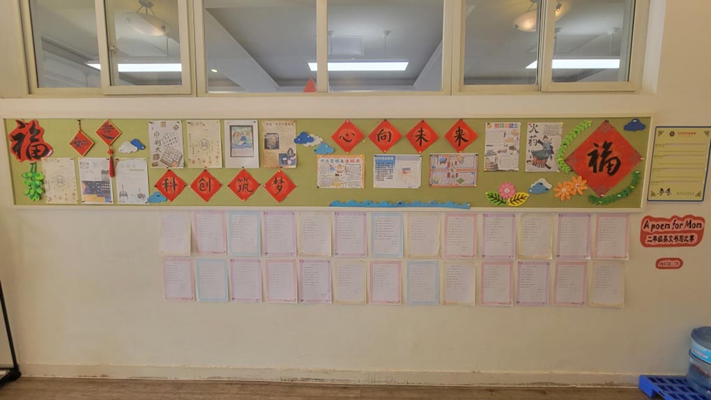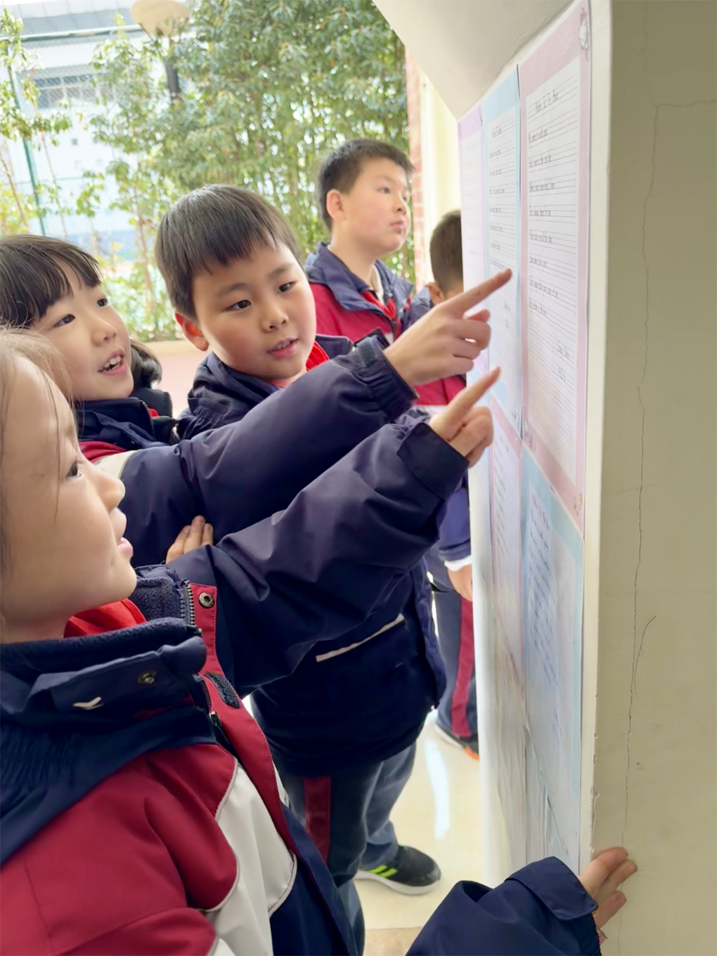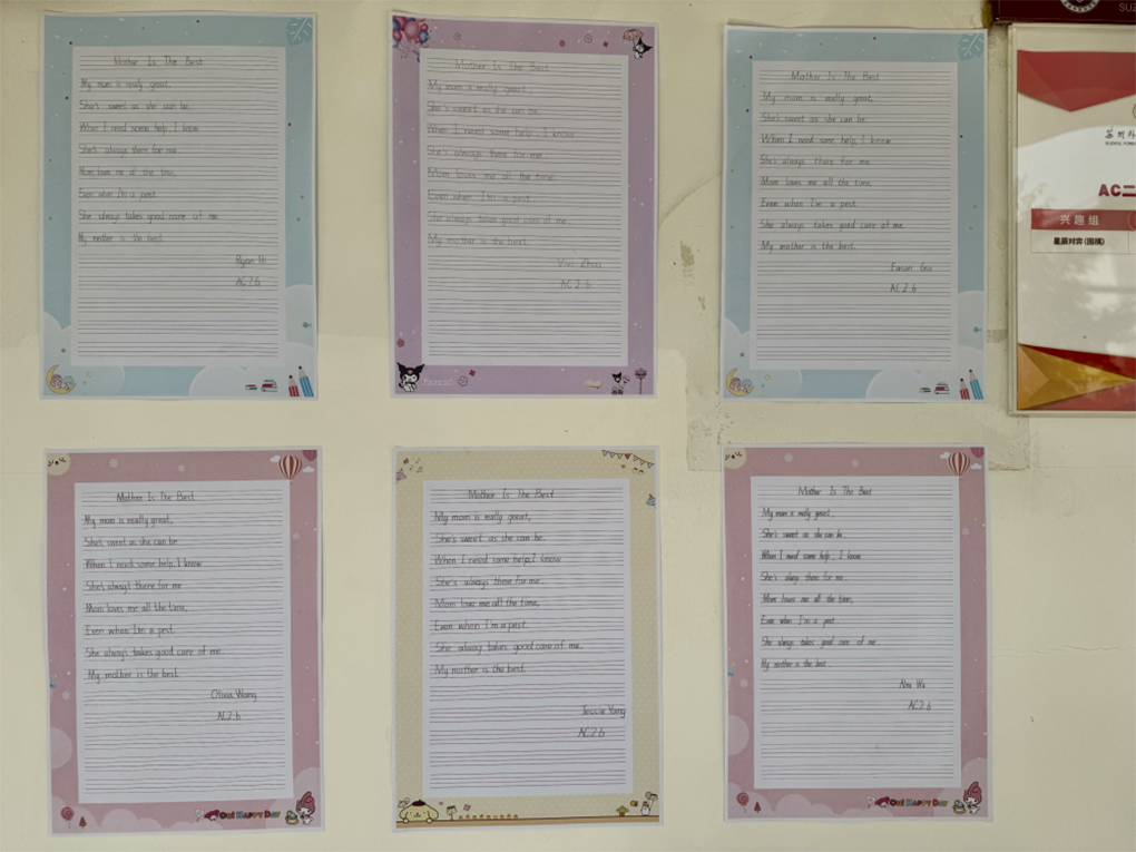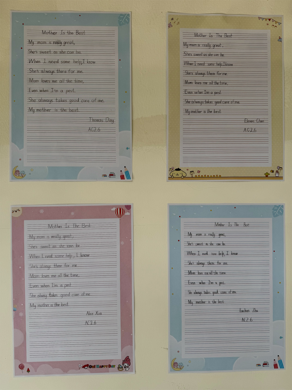 今年“妇女节”巧逢星期五,孩子们和老师一起把写好的“A Poem for Mum”整整齐齐地粘贴在了教室外墙上。前来接娃的家长们看见了,情不自禁啧啧称赞。瞧,他们拿出手机对着一件件作品拍拍拍,也有家长很快地找到了自家宝宝的作品,满脸喜悦。
