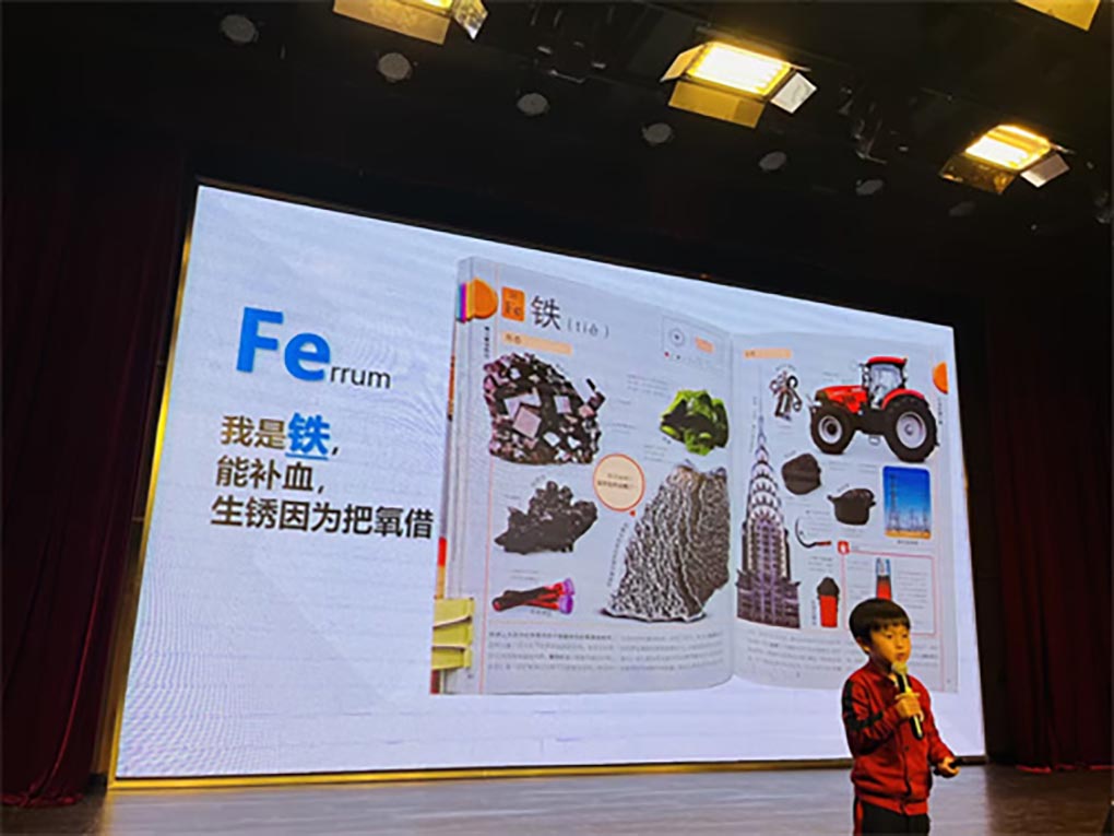 AC一(5)班的杨且歌,为我们分享了《神奇的化学元素》。小朋友们知道了在我们身边处处都有化学的元素,比如我们呼吸的氧气,生活中的二氧化碳,食物的酸碱性等等都是化学元素组成的。