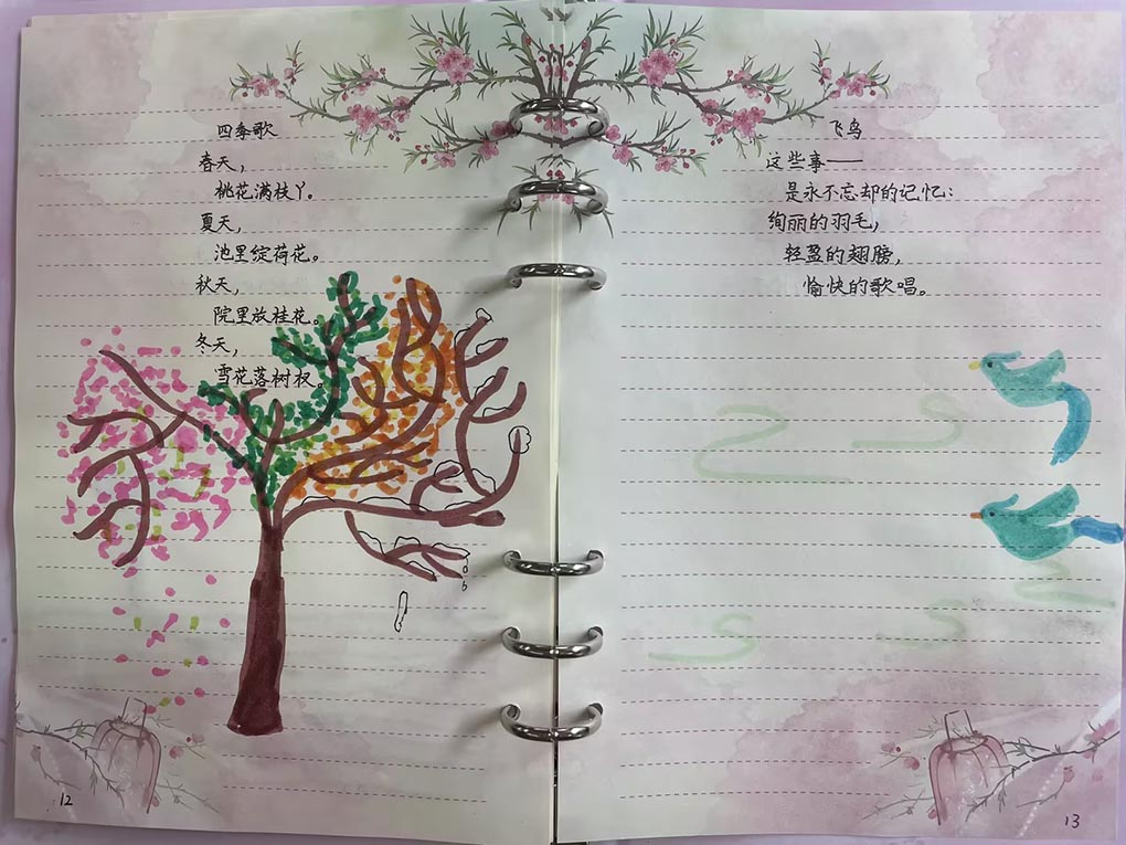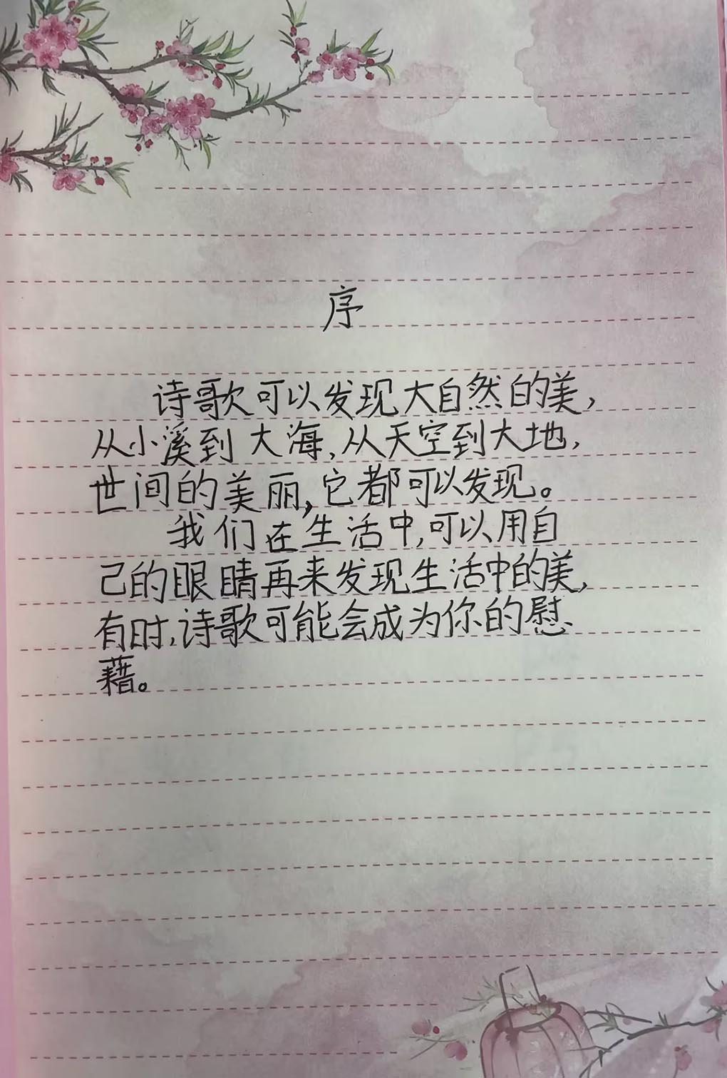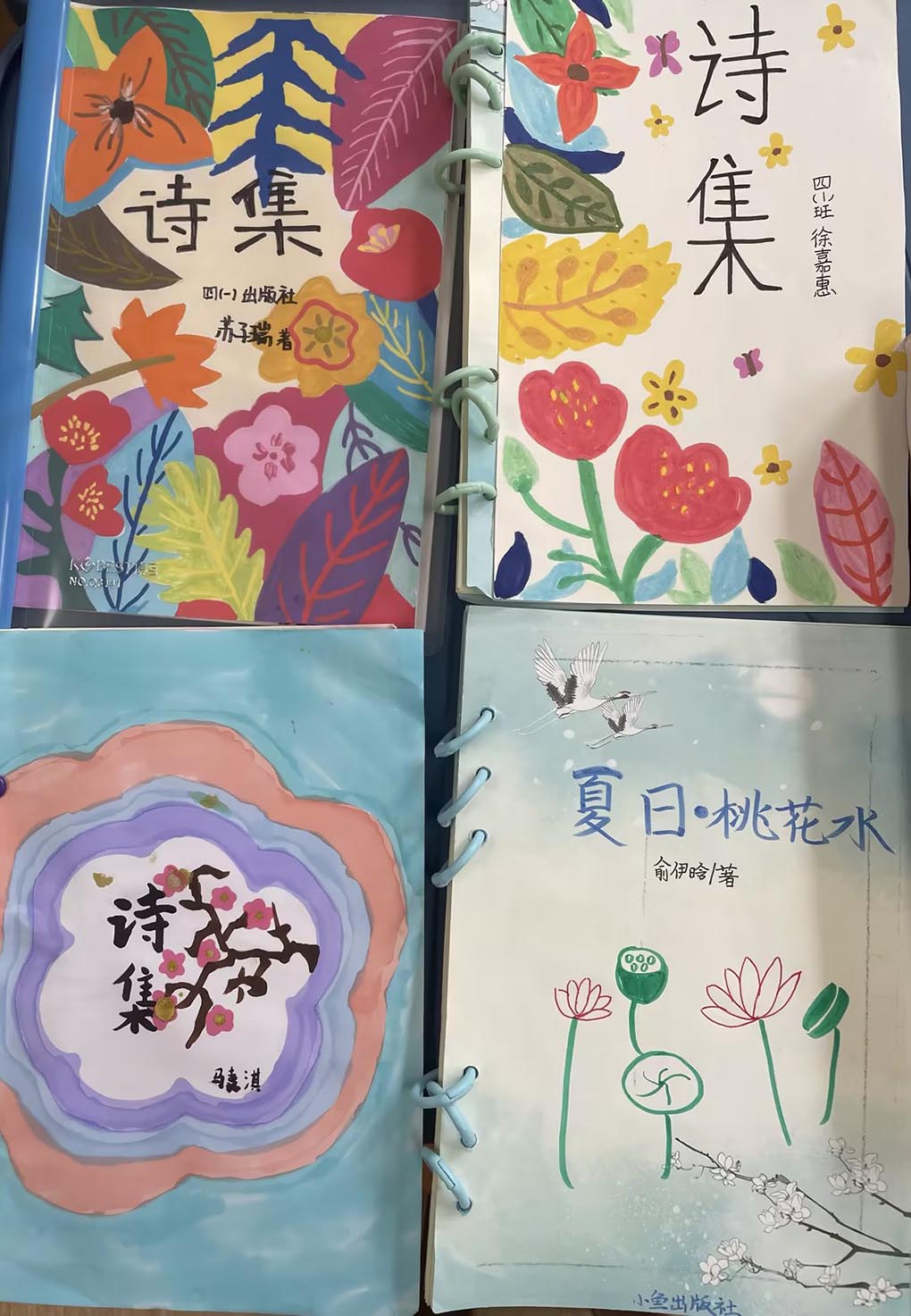 诗歌是思想的结晶,感情的浪花,视之可以愉目、读之可以愉耳、品之可以愉心。四年级下册第三单元是诗歌单元,孩子跟着课本诵读了大量的现代诗,课本上的、课外的;金波的、金子美玲的……孩子们在诵读诗歌中,心灵得以滋养,想象之门也被开启,创造出了大量灵动的诗歌。整理成册,画了封面,写了序,一本本精美的诗歌集华丽丽地亮相了。