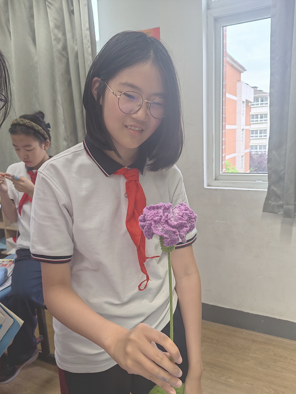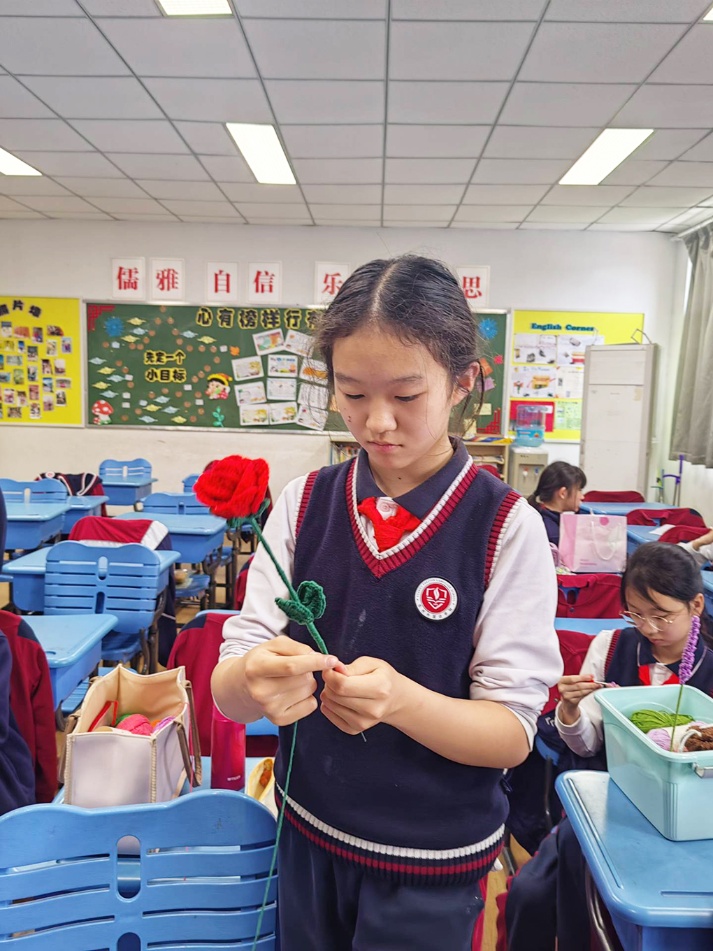 学期初,孩子们激动万分,经过上学期的学习,孩子们已经完全掌握了钩针的基础针法,本学期开始,她们可以制作属于自己的成品了。看,她们左手绕线,右手拿针,一个个聚精会神地钩着织物,手法越来越熟练。在孩子们的手中,一个个成品慢慢地呈现出来了,山茶花、薰衣草、康乃馨、铃兰花、玫瑰花、马蹄莲,孩子们织就了一个花的海洋。