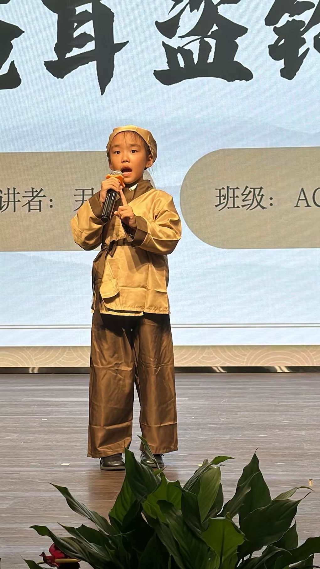 AC一2班的孙于杭带了一个小葫芦上台,为同学们讲述了卖油翁的故事,一句“唯手熟尔”告诉大家,想要练就真本事,必须苦下功夫、熟能生巧。故事大王尹言翕以丰富的表情和动作吸引着同学们的目光,她惟妙惟肖地演绎出了“掩耳盗铃”故事中小偷的蠢笨,让同学们捧腹大笑。