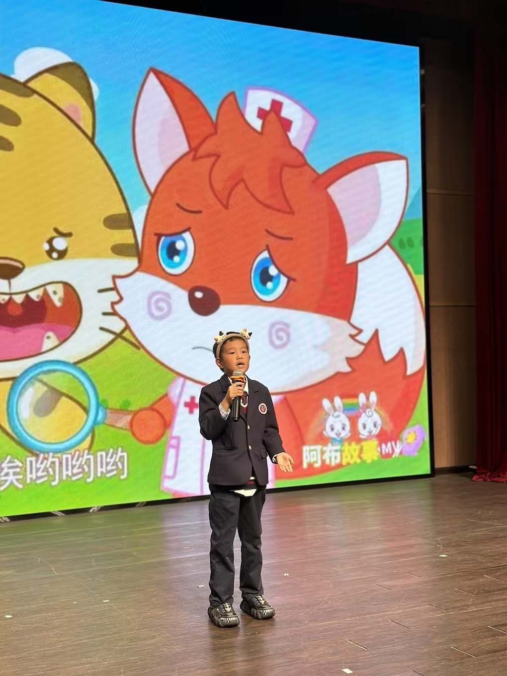 为大家“打头阵”的是AC一1班夏昀泽同学,他迈着自信从容的步伐走到舞台中央,开始声情并茂地讲着《小老虎拔牙》的故事,流利的表达、绘声绘色地讲演,一下子把同学们带入了情境中。当夏昀泽从口袋里掏出一颗老虎的“牙齿”时,更是让同学们惊叹不已。多么有意思的细节设计!大家听得津津有味。