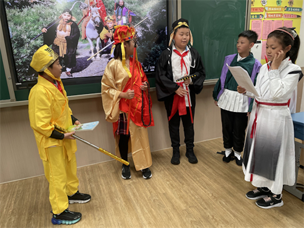 文中有戏,戏中有文。纵观古今中外的文化长廊,数不胜数的名人名著滋养着一代又一代中华儿女。细数卷卷课本,回味无穷的传统名篇囊括着智慧的结晶。这次读书节活动,五4班共读两本四大古典名著《西游记》《三国演义》。孩子们穿着剧中角色的服装,戴上各自角色的头饰,入情入境,声情并茂,活灵活现地演绎着生动有趣的故事情节,吸引着台下观众不由地进入剧情,时而欢笑,时而喝彩,时而哀叹,时而深思,时而兴奋,时而感慨……一个个发人深省的故事给我们深刻的启迪。学生学习语文的独特体验在课本剧的编演实践中得到了淋漓尽致的发挥。这次活动既是师生互动、心灵对话的课堂,也是学生点燃智慧、放飞理想的舞台。