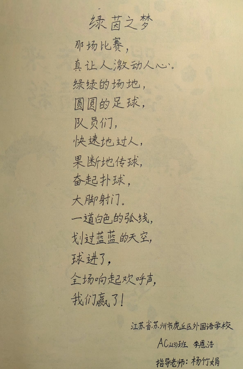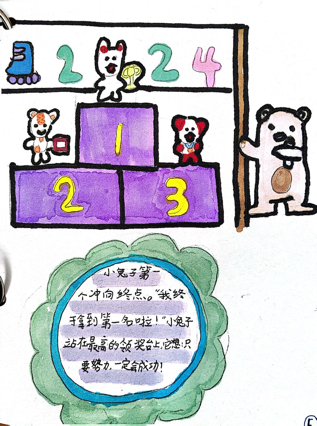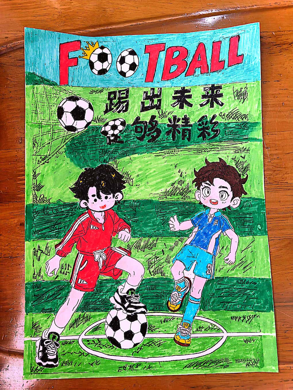 活动中,同学们纷纷化身小小艺术家和作家。他们有的眉头紧皱,思考着画作的构图与故事的脉络;有的则灵感泉涌,手中的笔在纸上飞快游走。从奇幻的魔法森林到未来的星际旅行,从温馨的家庭聚会到热血的体育赛场,丰富的主题在同学们的笔下和画中一一呈现。李同学精心绘制了一幅足球大赛的画面,这是他每周兴趣课的生活,他还用细腻的笔触描写了踢足球的生活,将美好的生活创编成一首儿歌。对学校生活的热爱与赞美表达俨然融汇在美图和美文中。