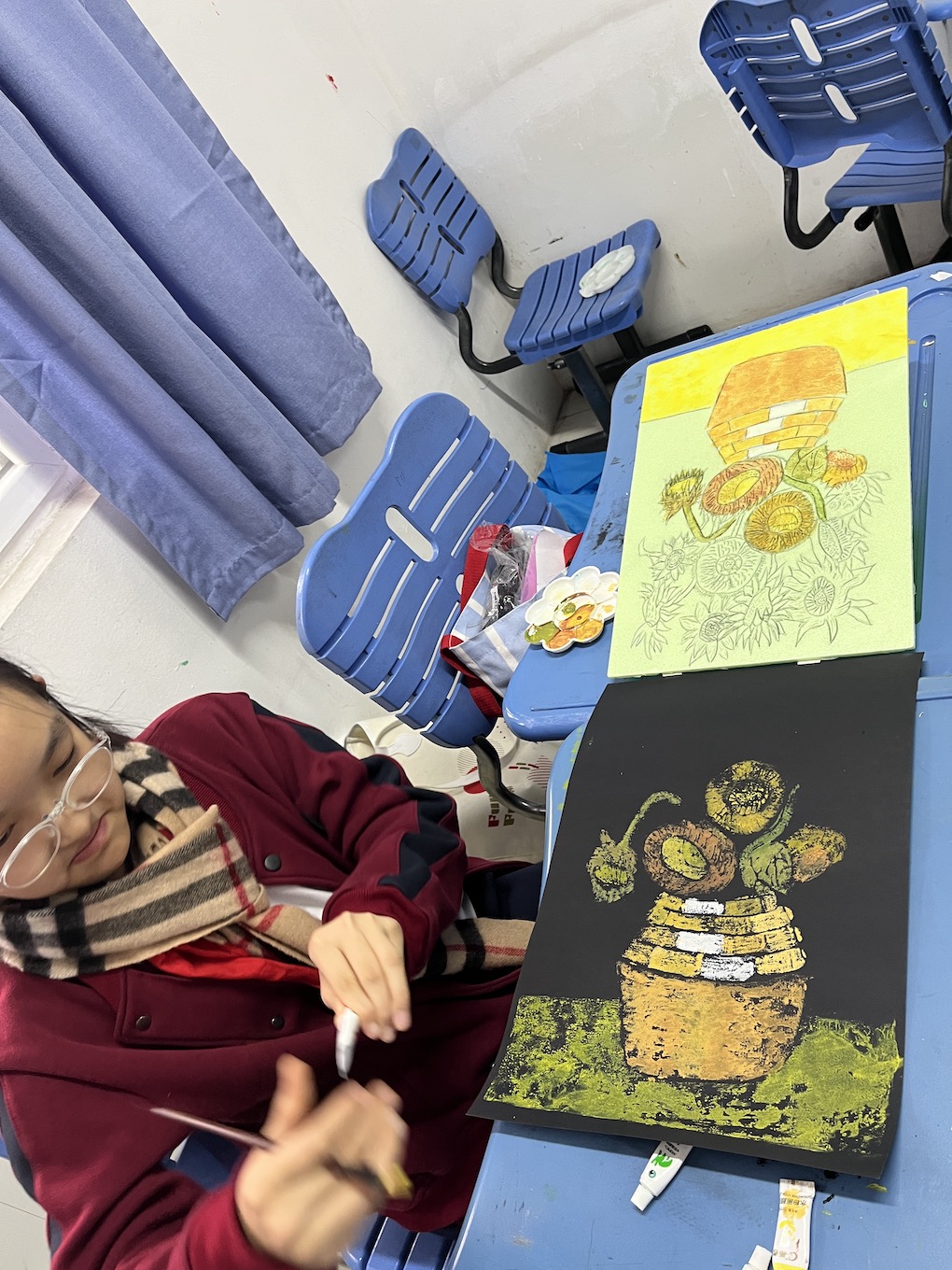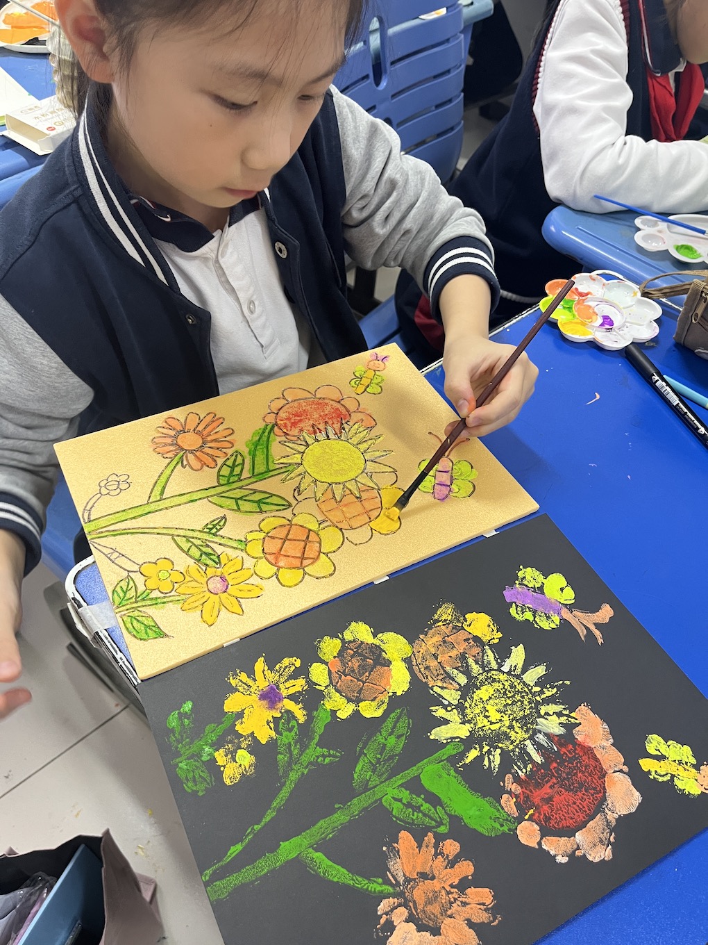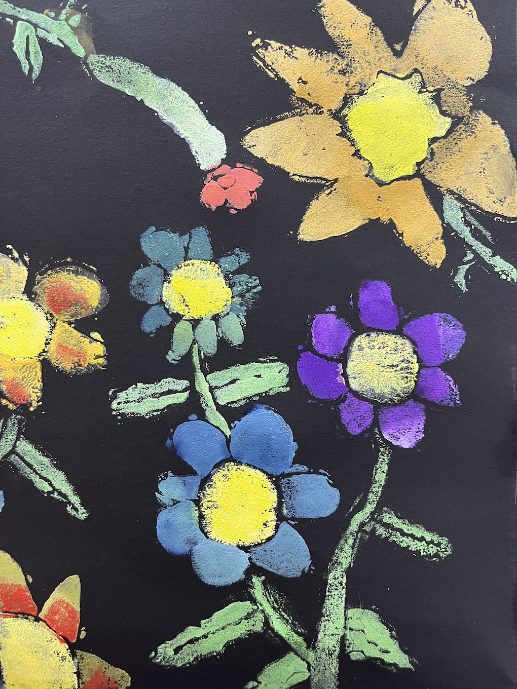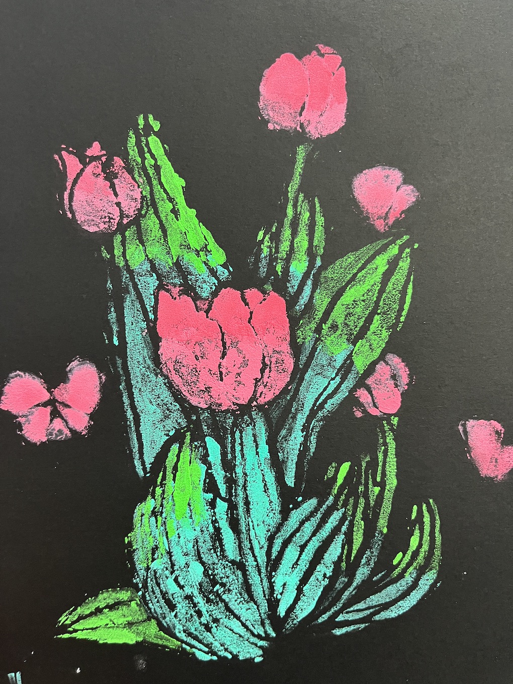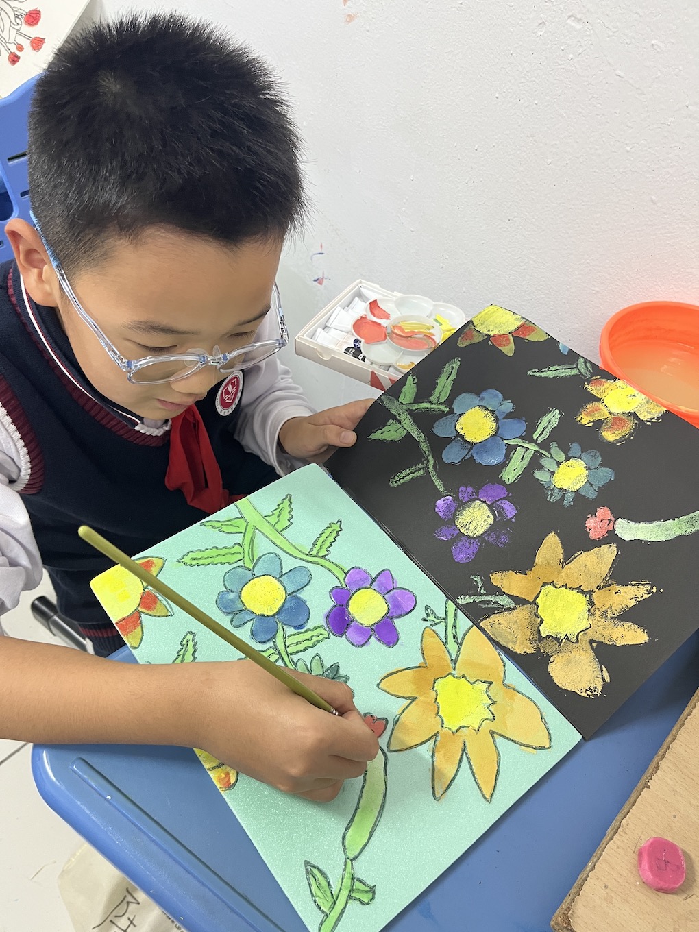 这学期学生创作出了许多吹塑纸版画艺术,这些丰富的课程和活动培养了学生对版画的兴趣和爱好,增长了知识,丰富了学生的文化生活,孩子们用智慧的双手画出了无数的作品。运用吹塑纸这一材料,使用粗铅笔在吹塑纸上画图案,然后再用水粉或水涂在吹塑纸上,之后再把吹塑纸往黑色的纸上拓印,画作就完成了。孩子们学会巧妙利用“留黑”手法,对刻画的形体作特殊处理,获得版画特有的艺术效果。他们通过巧妙的构图形式,以丰满密集和萧疏简淡等不同风格来衬托表现主题风格。
