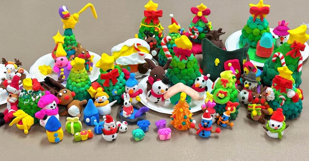 孩子们从学习制作简单的泥球和泥条到可以用基本型组合成一个完整的作品,最后呈现出许多精美的粘土作品,孩子们的学习能力和创造力真令人惊叹。孩子们还为不同节日创作了粘土作品:中秋节我们制作了美味的月饼,万圣节和圣诞节我们制作了氛围感的场景创作,冬天到了我们制作了暖暖的火锅大餐,感恩节我们做了漂亮的花束,新年来临之际我们还制作了造型各异的小蛇……
