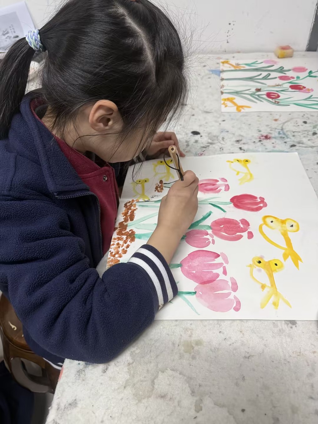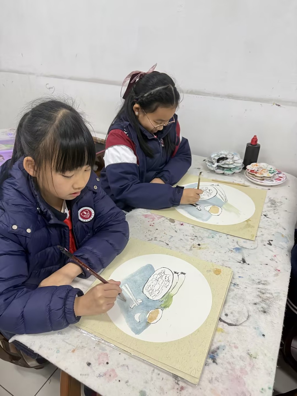 中国画一笔成型,无法修改,因此需要孩子们更多的专注力,心中有数,落笔才有准。一支毛笔沾上墨色后可以千变万化,下笔力度、笔锋走向,水墨浓淡都由一笔掌握。一笔一墨一幅画,至善至美至清雅,孩子们一笔一画地在宣纸上进行作画,兴趣盎然,被中国画的魅力深深吸引。