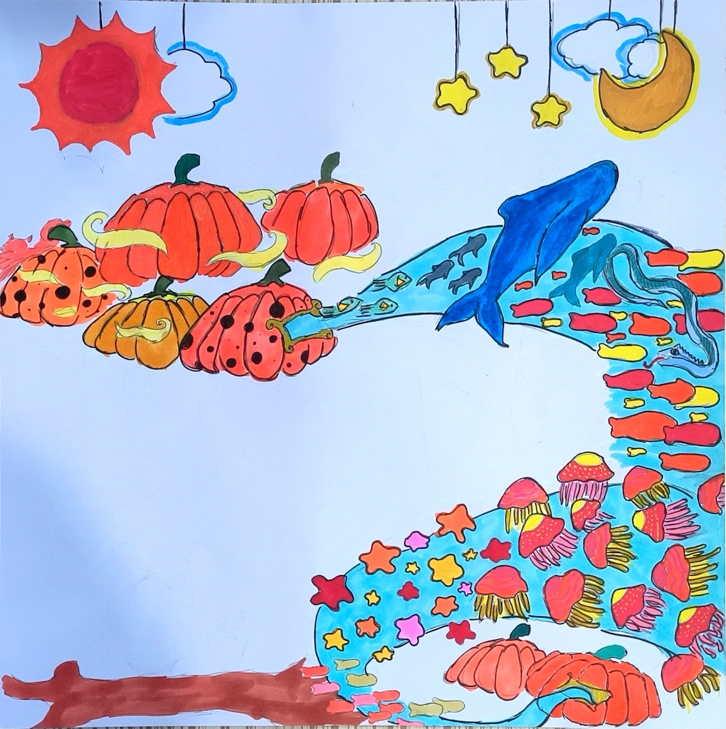 点是绘画中重要的语言,除了要改变点的大小、位置、色彩和疏密之外,如何运用这种原色画出有创意的画呢?教学中以草间弥生的作品为起点,在一件件平面或立体的作品中感受到点的魅力。随后从不同的摄影和艺术作品中发现和感受到点的形状可以是各,种形状, 可以是冬天飘落的雪花,夏夜里的繁星点点,可以是天空里的飞鸟,深海中的游鱼……同学们通过思维的碰撞和联想创作出了有趣的画面。深海中摇曳生姿的大鱼被小小的群鱼环绕,留声机里倾泻流淌的音符,点还能把新年梦想具象化。还有的同学用点元素创作出超现实风格的绘画,植物、动物,天空、陆地、海洋,生生不息,万物生长。