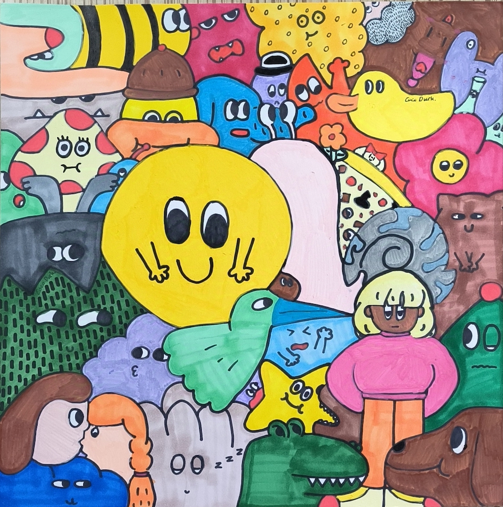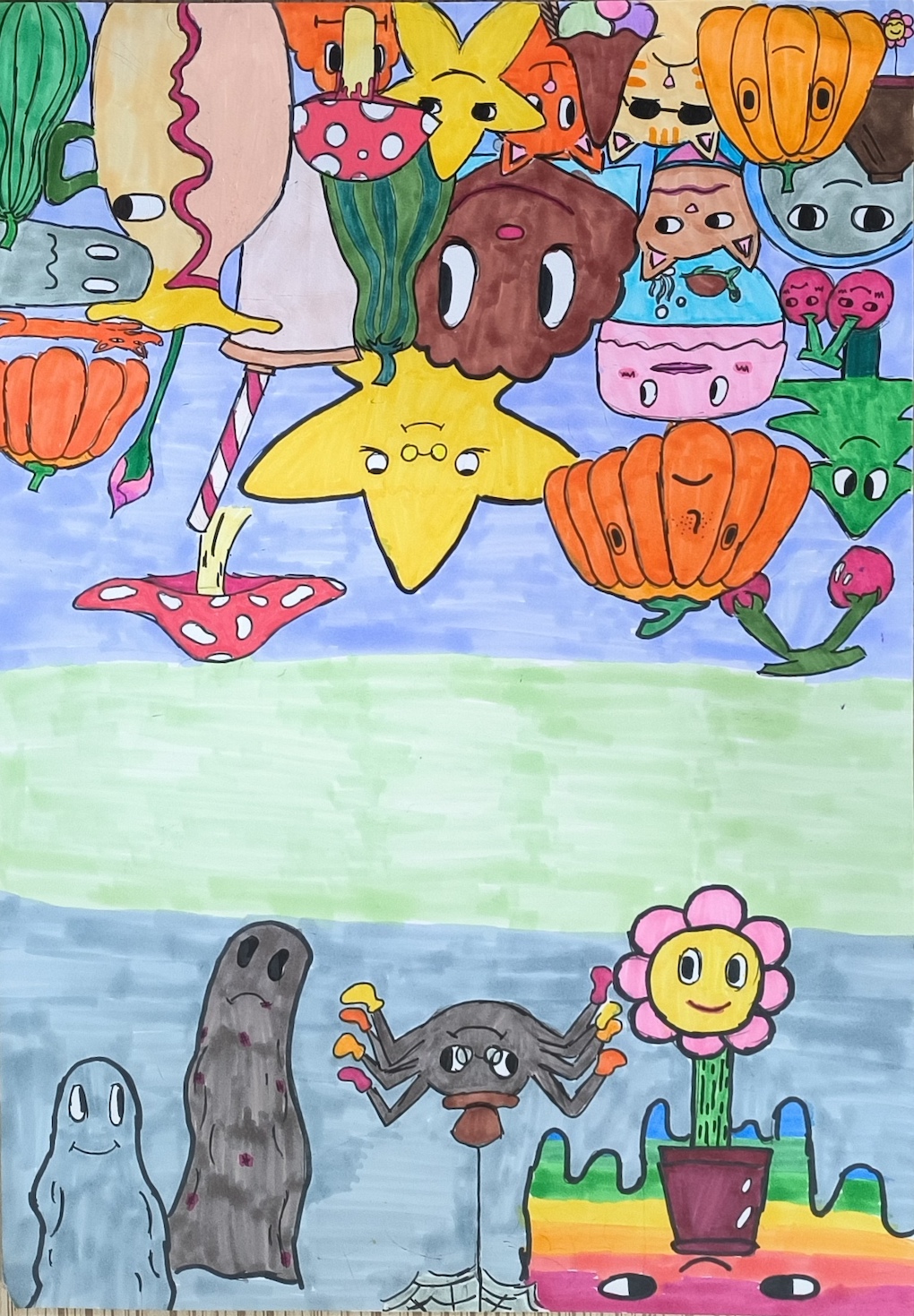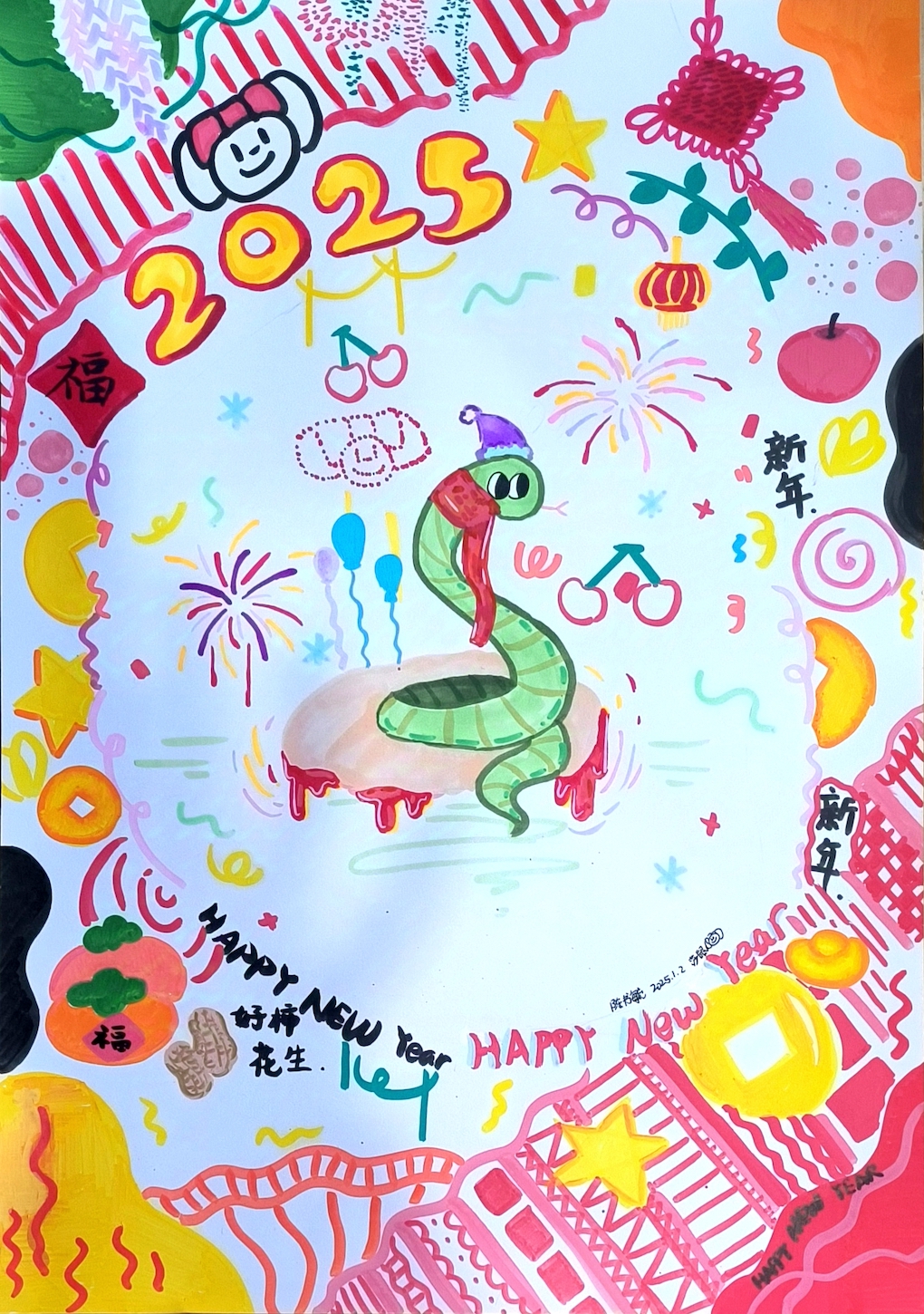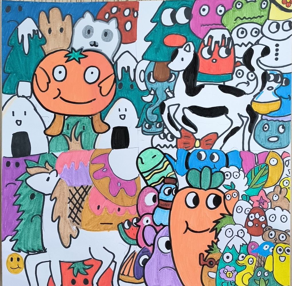 插画师的方法里藏着创意的钥匙,乌克兰插画家 Nina Dzyvulska,将日常生活中的事物结合,创造和谐有爱的画面。作品中透露出的简单、纯粹和有趣。画面中喜欢对比色的运用,跳跃的配色让人目不暇接。同学们通过欣赏和分析,创作出灵动的作品。同学们学习了插画师的构图采用重叠式构图或者正负形。画面中一个一个小动物和角色彼此紧挨着,瞪着小小的眼珠懵懂又可爱。这些形象有着丰富多彩的面部表情,小眼睛格外传神。
