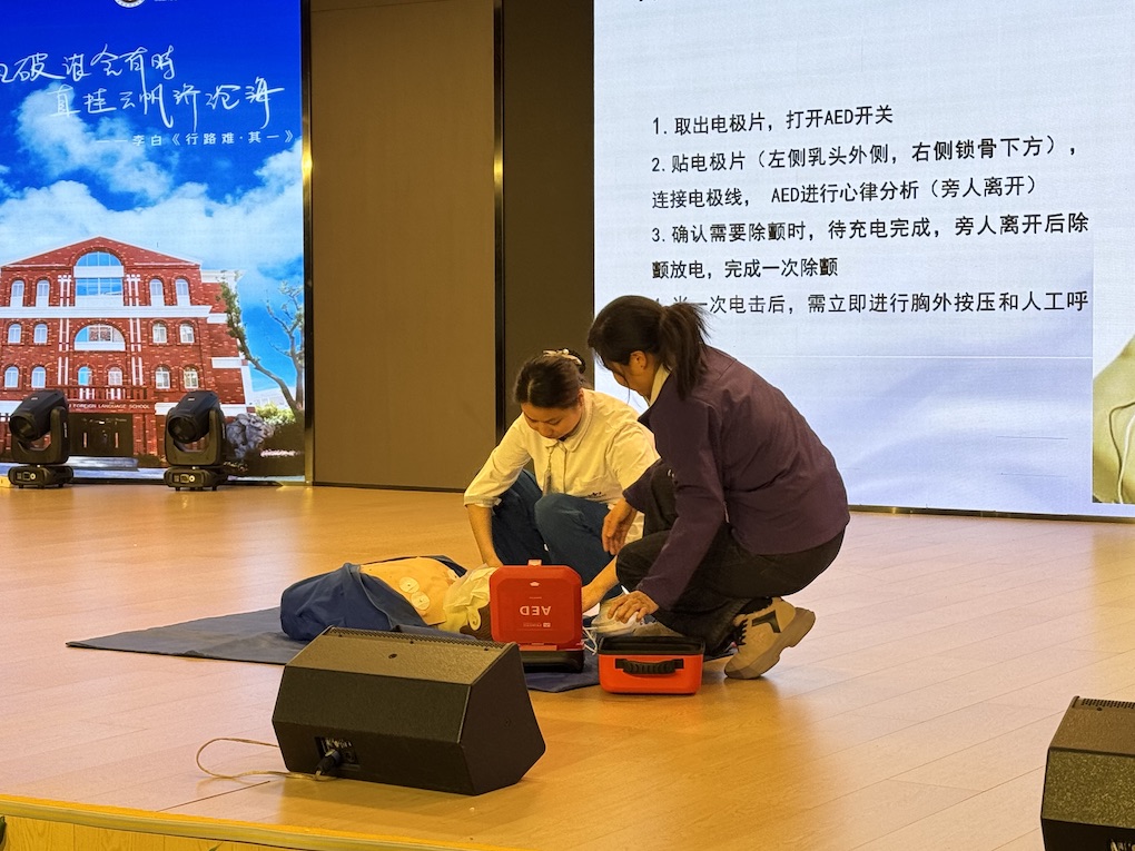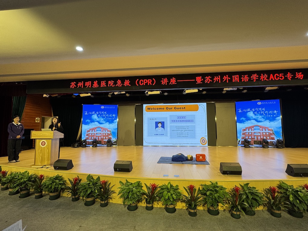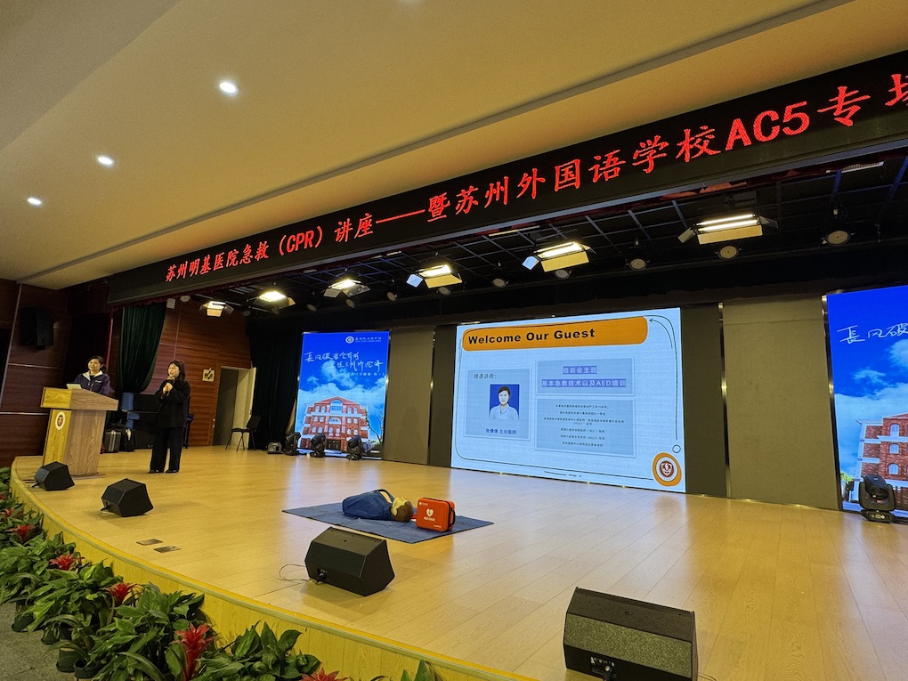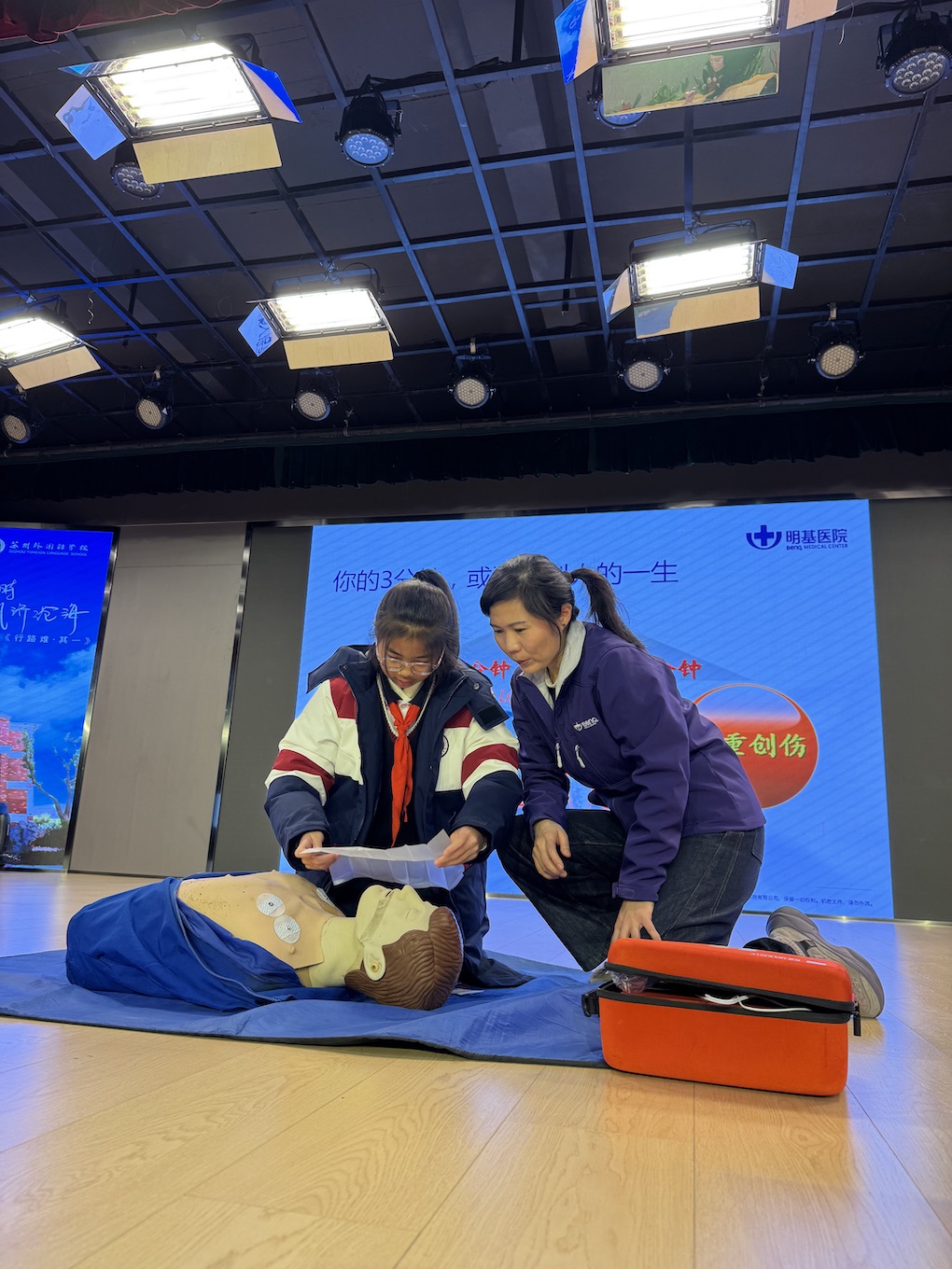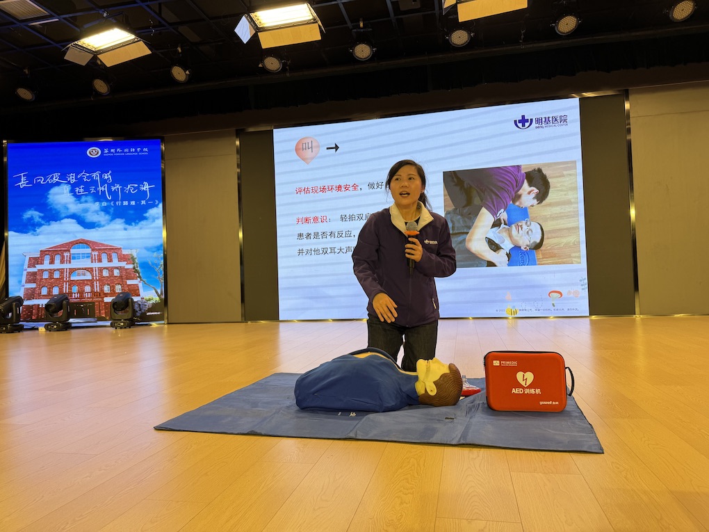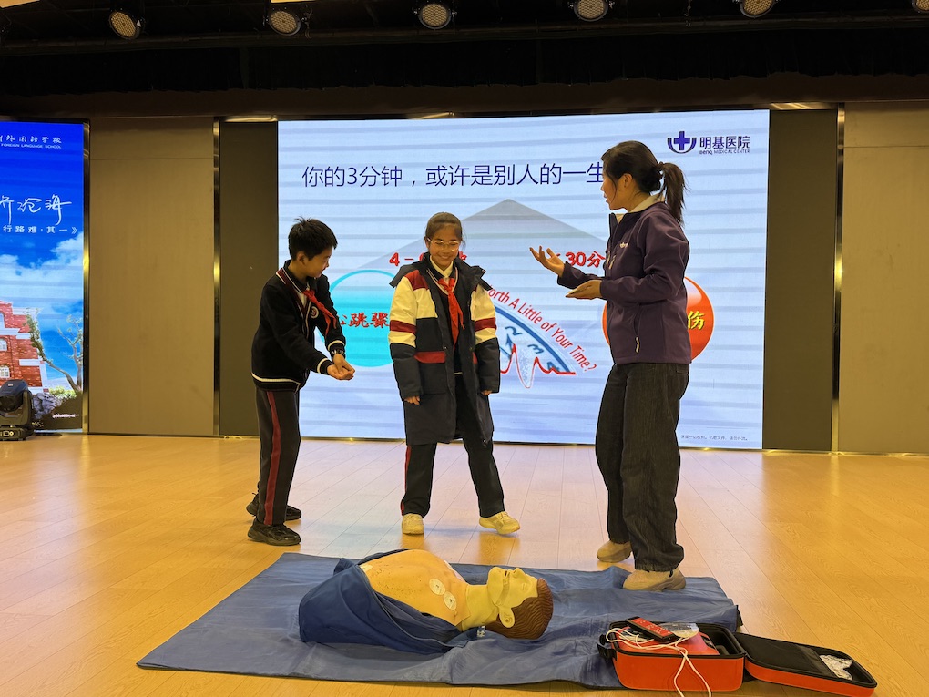 为了让孩子们更增强对生活中应对突发事件的应急处理能力,将课堂所学用于生活实践,在家委会的协助下,请来了明基医院急救中心的医生团队们,给AC五的孩子们带来了一场精彩的急救(CPR)讲座。专业急救讲师张医生通过生动形象地讲解,深入浅出地阐述了心肺复苏地重要性以及卖你对心脏骤停时黄金急救法一—“海姆利克”急救法。理论讲解之后,进入实操环节。张医生现场示范心肺复苏地操作流程,从判断患者意识、拨打急救电话,到胸外按压、开放气道、人工呼吸等关键步骤,每一个细节都十分到位。孩子们听得专注投入,踊跃尝试实践操作,现场气氛十分活跃。