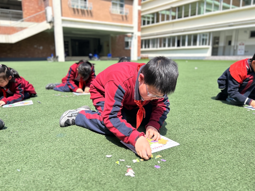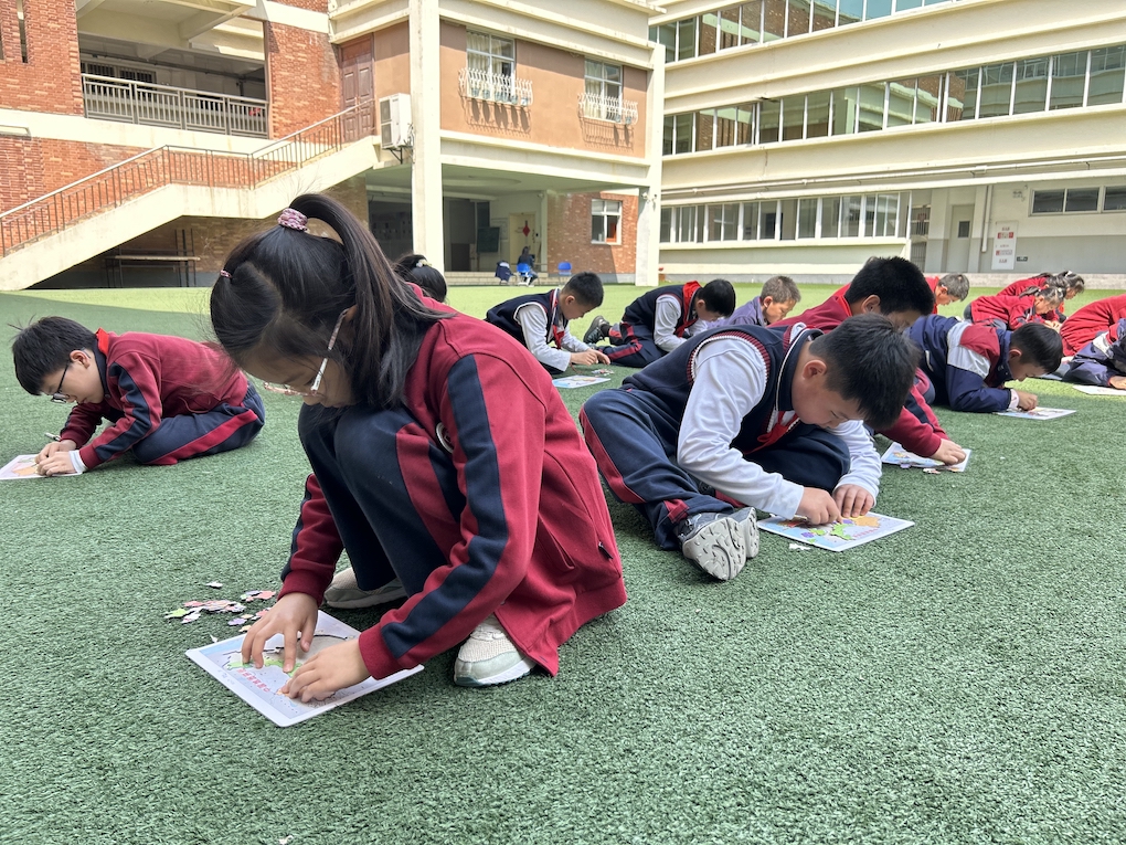 本次拼图比赛活动在医务室东侧的小操场举行。只见比赛现场,气氛紧张而热烈。三年级的小选手们全神贯注,紧紧盯着面前打乱的地图碎片。随着老师一声令下,他们迅速投入“战斗”,小手灵活地翻转、拼接,眼神中透露出坚定与专注。有的孩子胸有成竹,凭借对地图的熟悉快速找到关键板块;有的稍显紧张,但也不气馁,仔细比对轮廓,不断尝试。