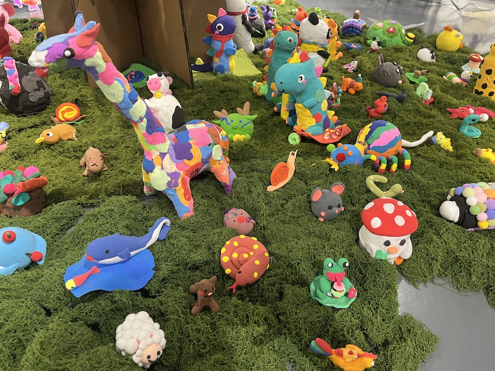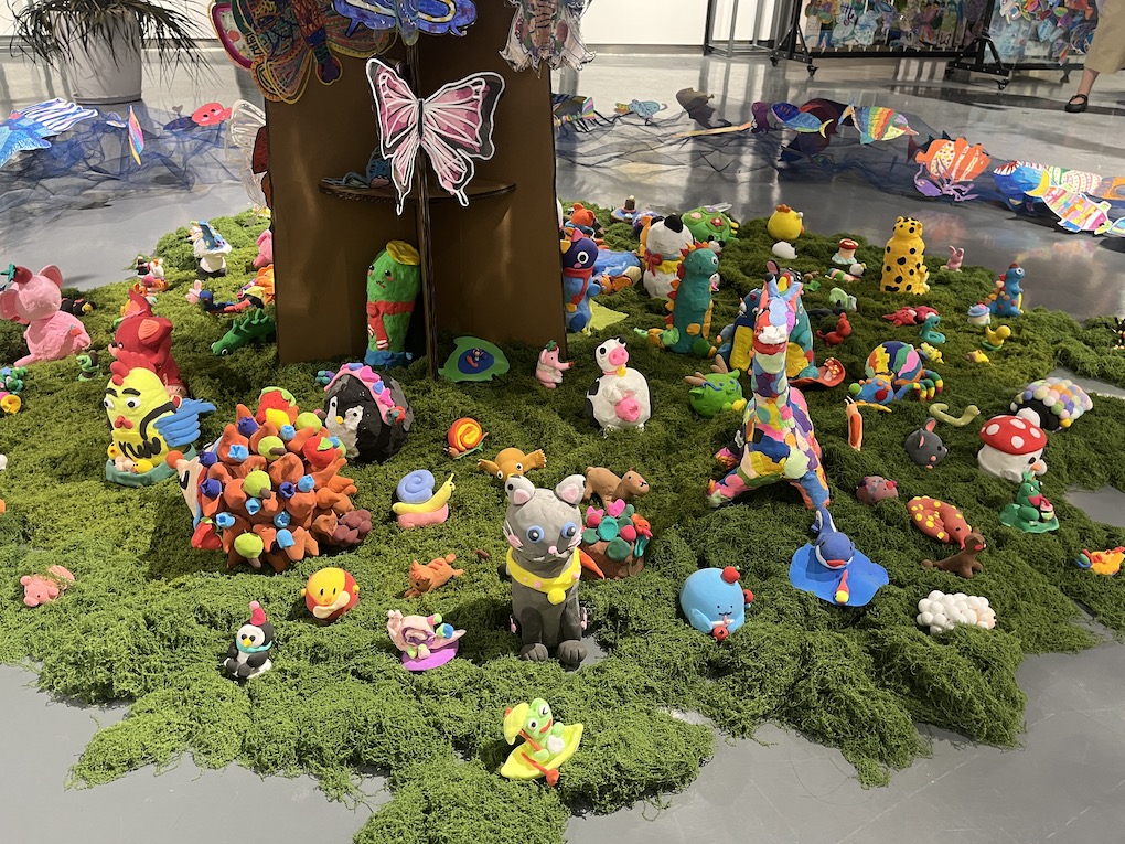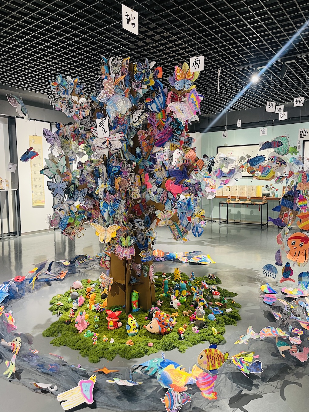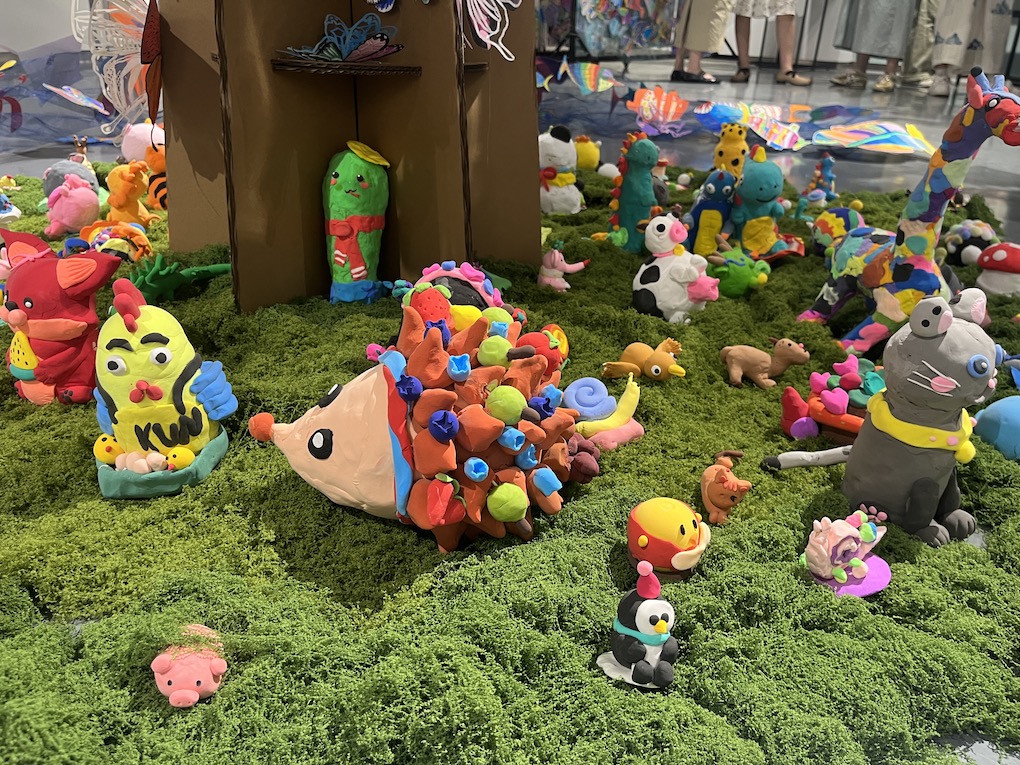 展览的核心《蝶栖·百灵衍》,是当代艺术与生态美学的结晶。这座由万千塑料蝴蝶栖居的参天巨树,以环保纸材构筑枝干,用丙烯彩绘点亮生命。当清风徐来,蝶翼间镶嵌的透明塑料片折射出星芒般的渐变光影,塑料碰撞的窸窣声与光影的流动,恰似生态系统的呼吸韵律。这件集体创作的装置艺术,暗合庄子“物我两忘”的哲思——数万只被人类丢弃的塑料,在少年的巧思中重获新生,化为永恒振翅的蝴蝶。这不仅是材料的重生,更是对生态文明的隐喻:真正的永恒,不在于征服自然,而在于学会聆听万物共生的心跳。此刻,蝴蝶正在光影中振翅,少年的笔尖仍在生长绿意。树下草地上的动物用粘土手工制作,草地周围运用铁网和蓝色纱布制作河流,可爱的的生物在水里游来游去。整个场景是孩子们巧手绘制的“自然生态系统”。