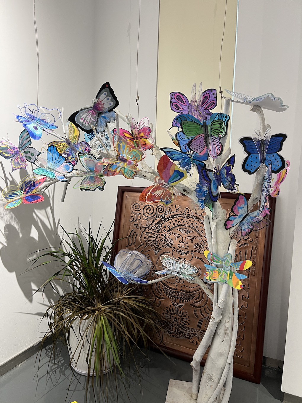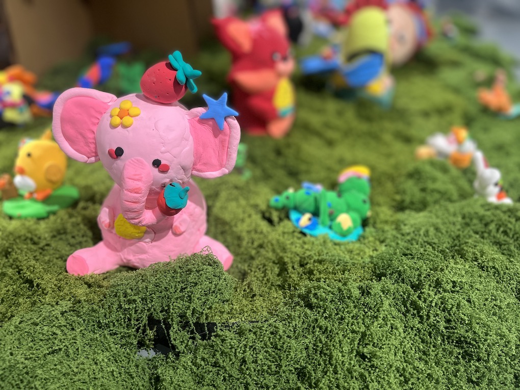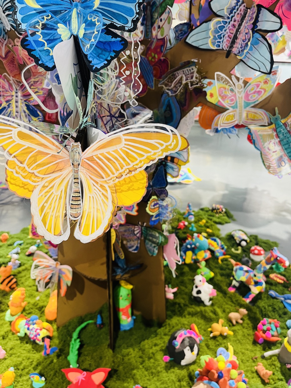 展览的核心《蝶栖·百灵衍》,是当代艺术与生态美学的结晶。这座由万千塑料蝴蝶栖居的参天巨树,以环保纸材构筑枝干,用丙烯彩绘点亮生命。当清风徐来,蝶翼间镶嵌的透明塑料片折射出星芒般的渐变光影,塑料碰撞的窸窣声与光影的流动,恰似生态系统的呼吸韵律。这件集体创作的装置艺术,暗合庄子“物我两忘”的哲思——数万只被人类丢弃的塑料,在少年的巧思中重获新生,化为永恒振翅的蝴蝶。这不仅是材料的重生,更是对生态文明的隐喻:真正的永恒,不在于征服自然,而在于学会聆听万物共生的心跳。此刻,蝴蝶正在光影中振翅,少年的笔尖仍在生长绿意。树下草地上的动物用粘土手工制作,草地周围运用铁网和蓝色纱布制作河流,可爱的的生物在水里游来游去。整个场景是孩子们巧手绘制的“自然生态系统”。