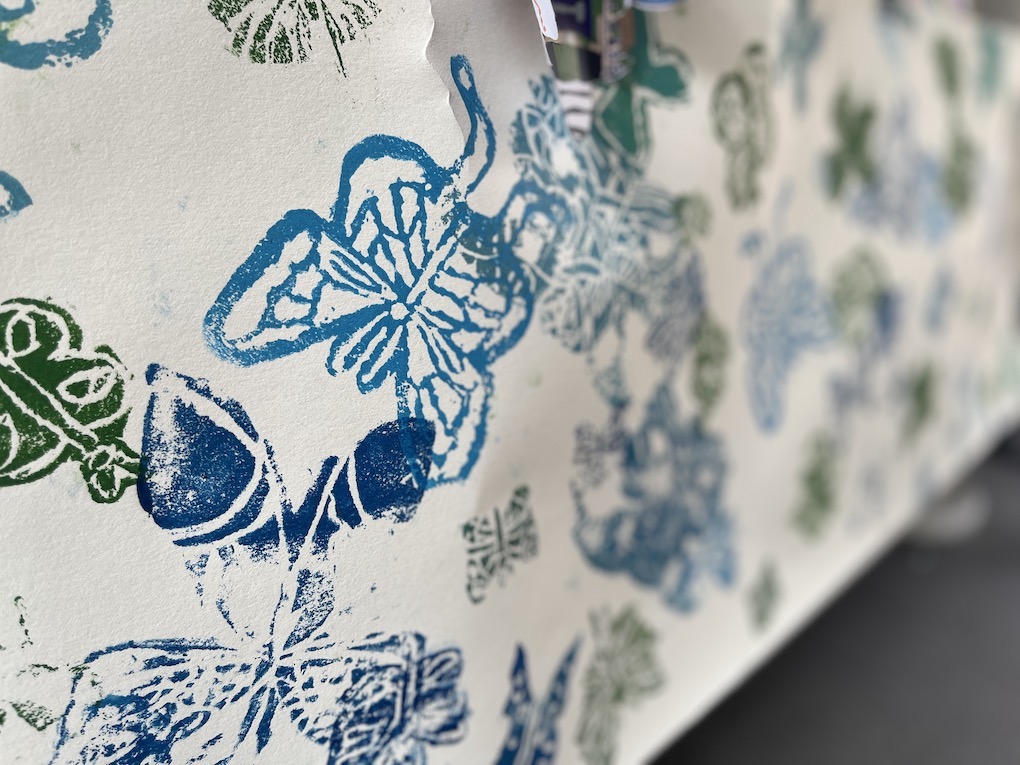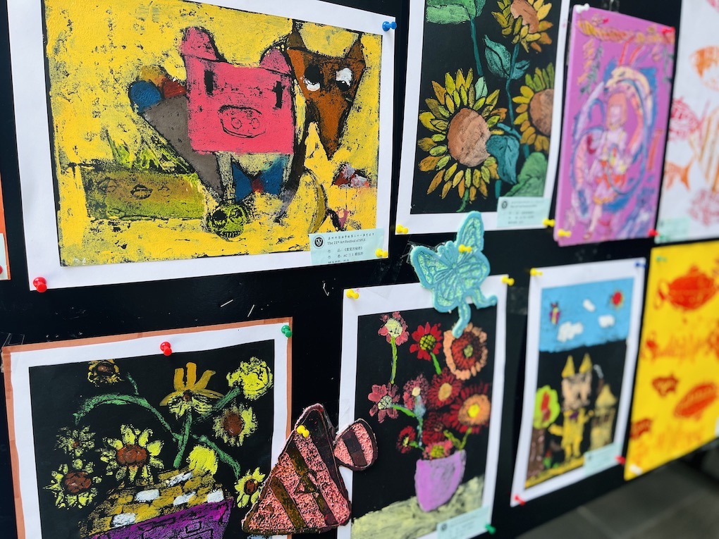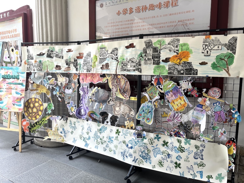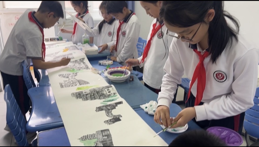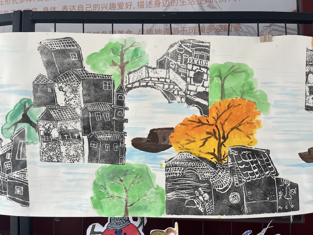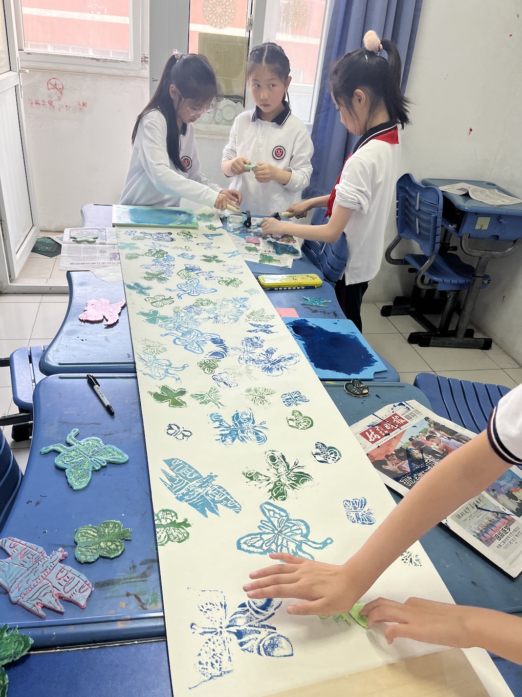 展览现场最引人注目的当属长达6米的《烟雨江南》和《蝴蝶翩翩》两幅大型集体创作。《蝴蝶翩翩》是孩子们用自己绘制的蝴蝶模版反复拓印。《烟雨江南》以青瓦白墙、小桥流水的水粉晕染,构筑出诗意盎然的水乡画卷。“原来一模一样的图案是这样诞生的!”参观者的同学们在了解制版、滚墨、覆纸、压印的全过程后恍然大悟,现场惊喜连连。这种“创作-展示-传播”的闭环模式,既是对传统文化的创新传承,也让美育真正融入校园生活。