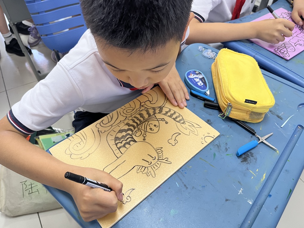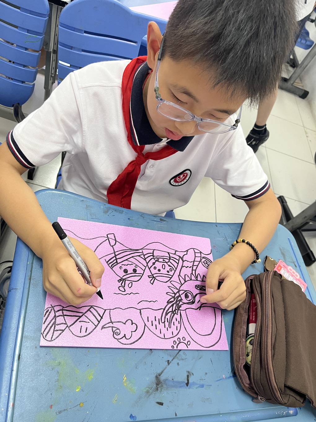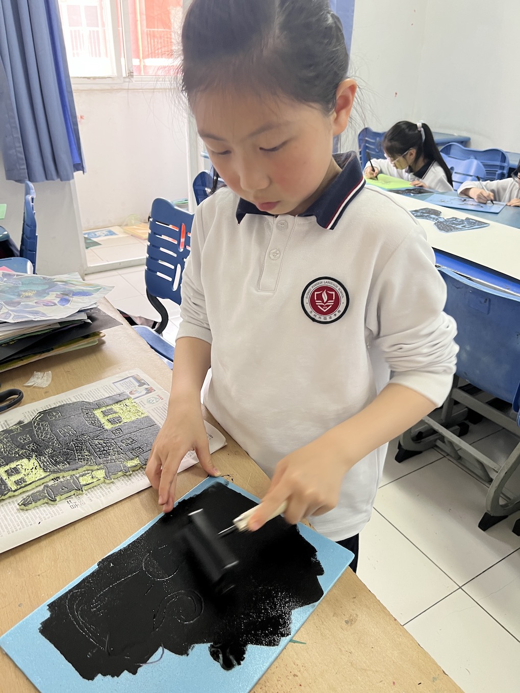 本次展览是小学部美术特色课程的一次成果汇报。据指导老师介绍,学生们自开学月起便投入创作,以竹棒、铅笔为"刀",在吹塑纸板上雕刻出深浅不一的痕迹。三年级的王同学现场演示时说道:"刻得太轻印不出来,刻得太重又会穿透纸板,每道痕迹都要像对待蝴蝶翅膀一样小心。"这种需要精准把控力度的创作过程,不仅培养了学生的专注力,更让他们在实践中领悟"力与美"的艺术思维。
