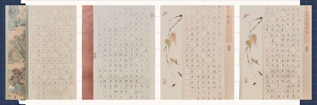 在书法课堂教学中,鲜老师时常渗透“字如其人”理念,通过“人字两笔”解析做人道理:起笔喻谦逊,行笔喻正直,收笔喻担当。学生们在书写作业、贺卡时主动运用课堂所学,实现"提笔即练字"的教学目标。