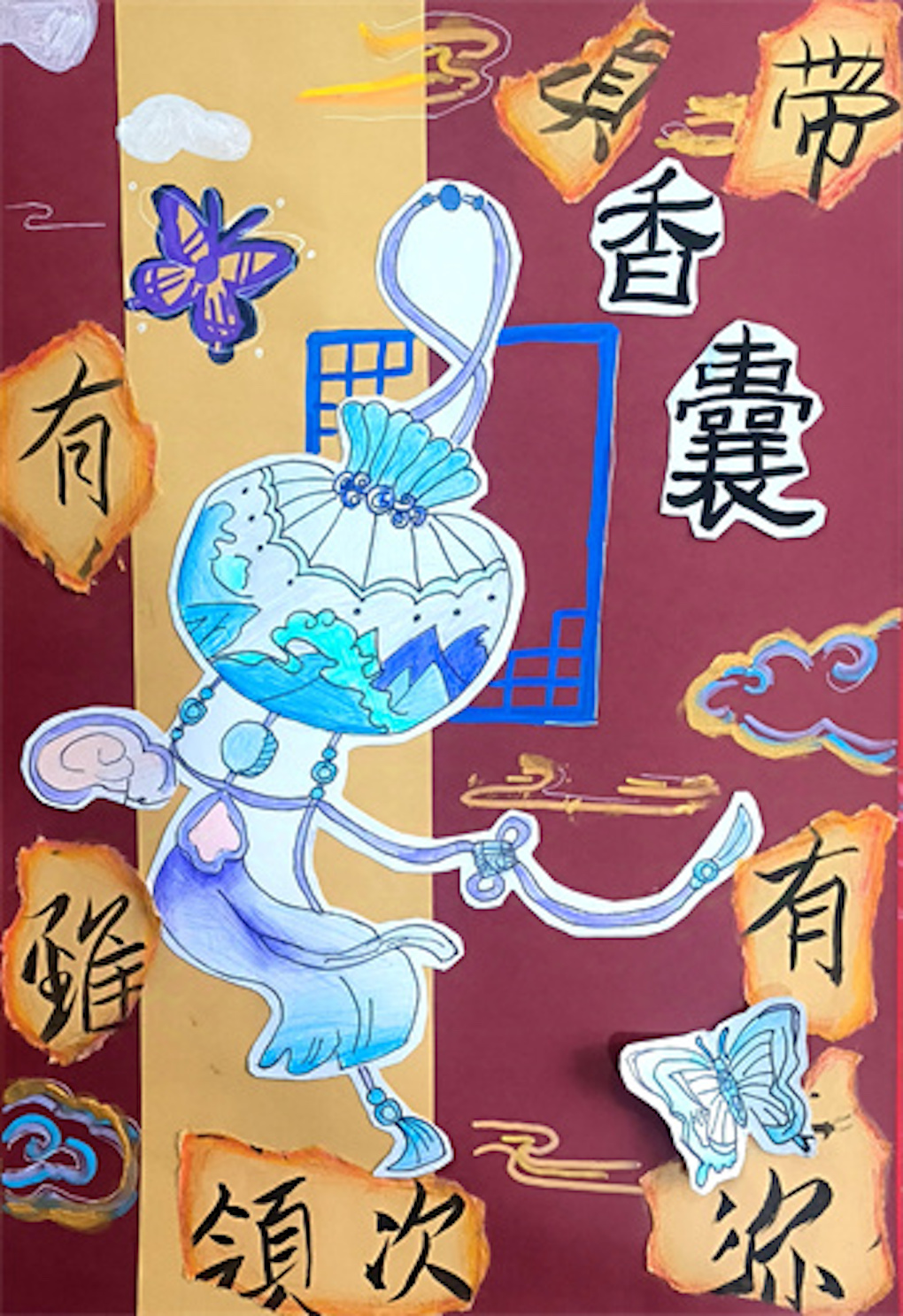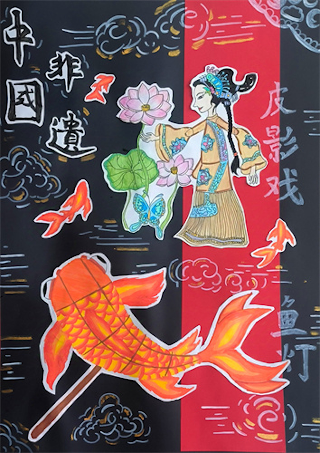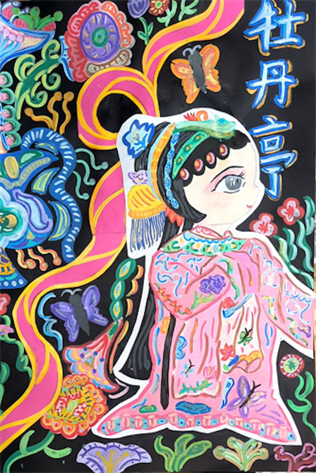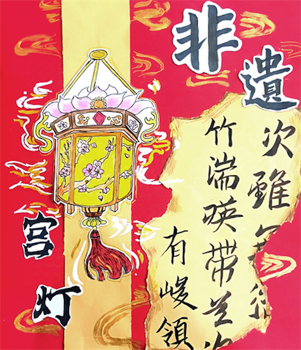 同学们深入探索非遗文化的深厚底蕴,从苏扇的精致风雅、昆曲《牡丹亭》的缠绵悱恻,到皮影戏的灵动光影、苏式彩灯的华美璀璨,以及糖画的甜蜜趣味、剪纸的质朴韵味,都成为他们画纸上流淌的源泉。创作中,他们大胆创新技法:或选取古朴牛皮纸,挥毫书写书法作为基底,再将边缘精心撕出自然破损,用彩铅巧妙晕染边缘,仿佛画卷历经时光淬炼、余烬犹温,沧桑感扑面而来;或融入江南水乡的蓝印花布元素,让清新典雅的蓝白韵律在背景中静静流淌。