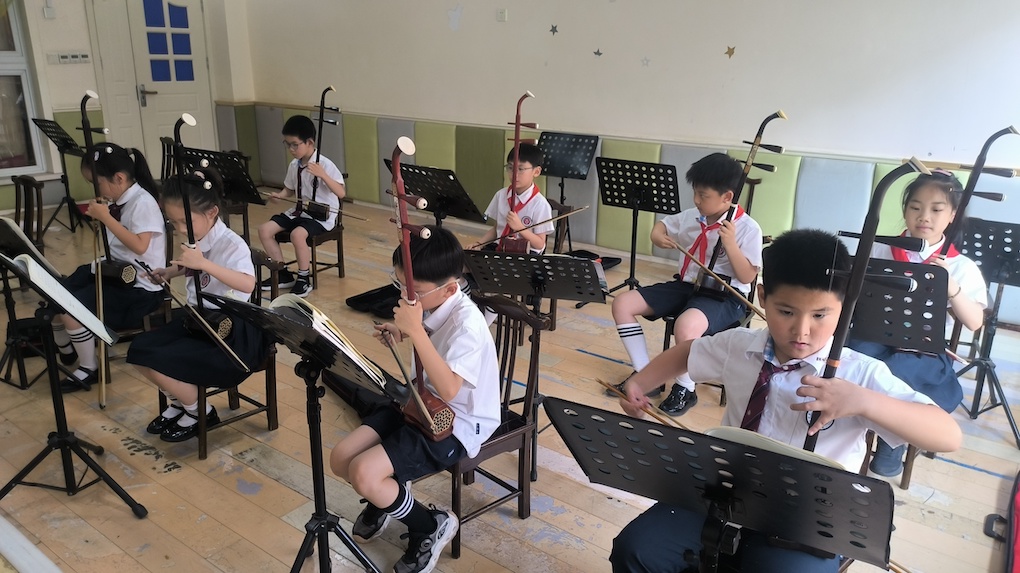 基本功练习是每堂的“必修课”。从空弦练习到简单的音阶,从长弓的平稳运弓到短弓的灵巧跳跃,孩子们在老师的带领下反复打磨。“一二三四,手腕放松,弓毛贴住琴弦!”伴随着刘老师的节拍声,教室里响起整齐的“沙沙”运弓声。