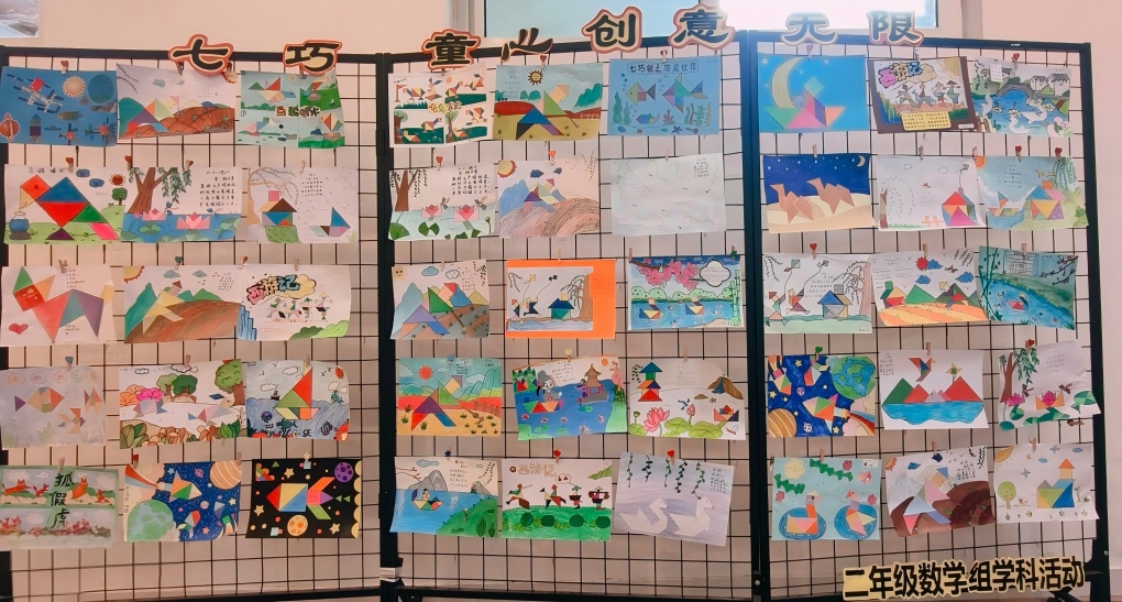 为进一步激发学生的数学学习兴趣,培养他们的空间想象力与创造力,二年级数学组于近日结合“科技体育节”,举办了以“七巧童心·创意无限”为主题的七巧板拼图小报展览活动。本次展览充分展示了孩子们在数学与艺术融合中的无限潜能,整个展区色彩斑斓,充满童趣与创意。