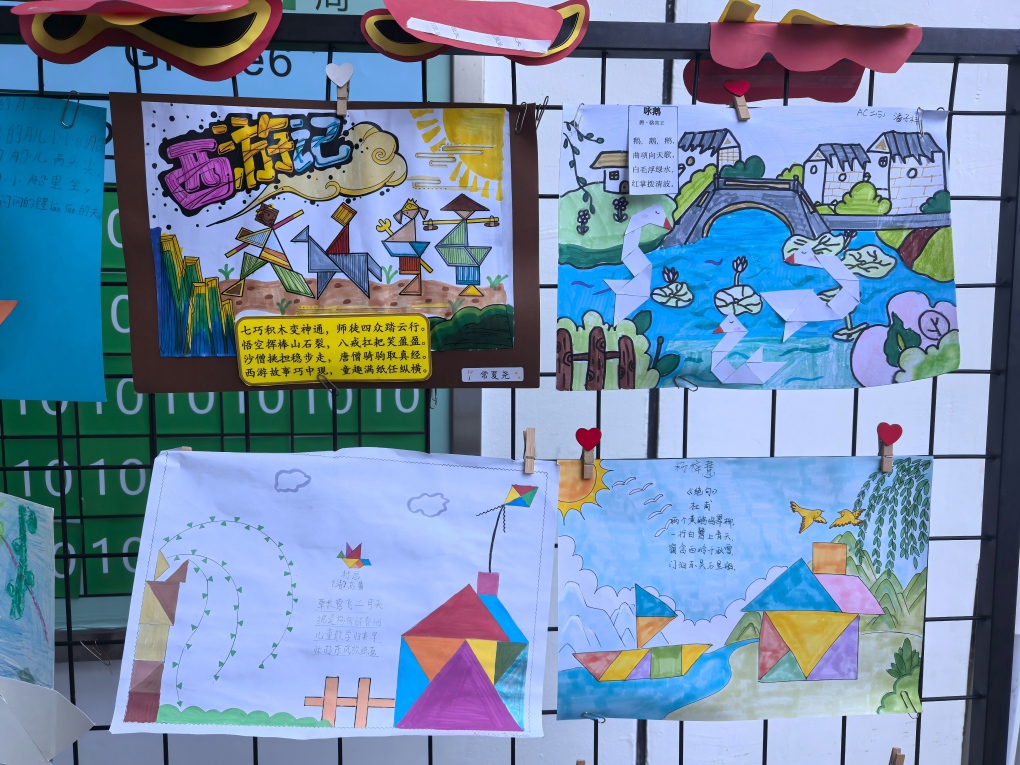 活动以“七巧板拼图创作”为核心,学生们在老师的引导下,运用七巧板进行丰富多样的图形创作,并将作品与绘画、剪贴、故事讲述等多种形式相结合。展板上,一幅幅作品构思巧妙、造型多样,有的描绘了蓝天白云下的房屋、山川与小船,有的展现了太空飞船遨游宇宙的奇幻场景,还有的将经典故事《西游记》巧妙融入拼图创作之中,展现出学生们独特的想象力与表达力。