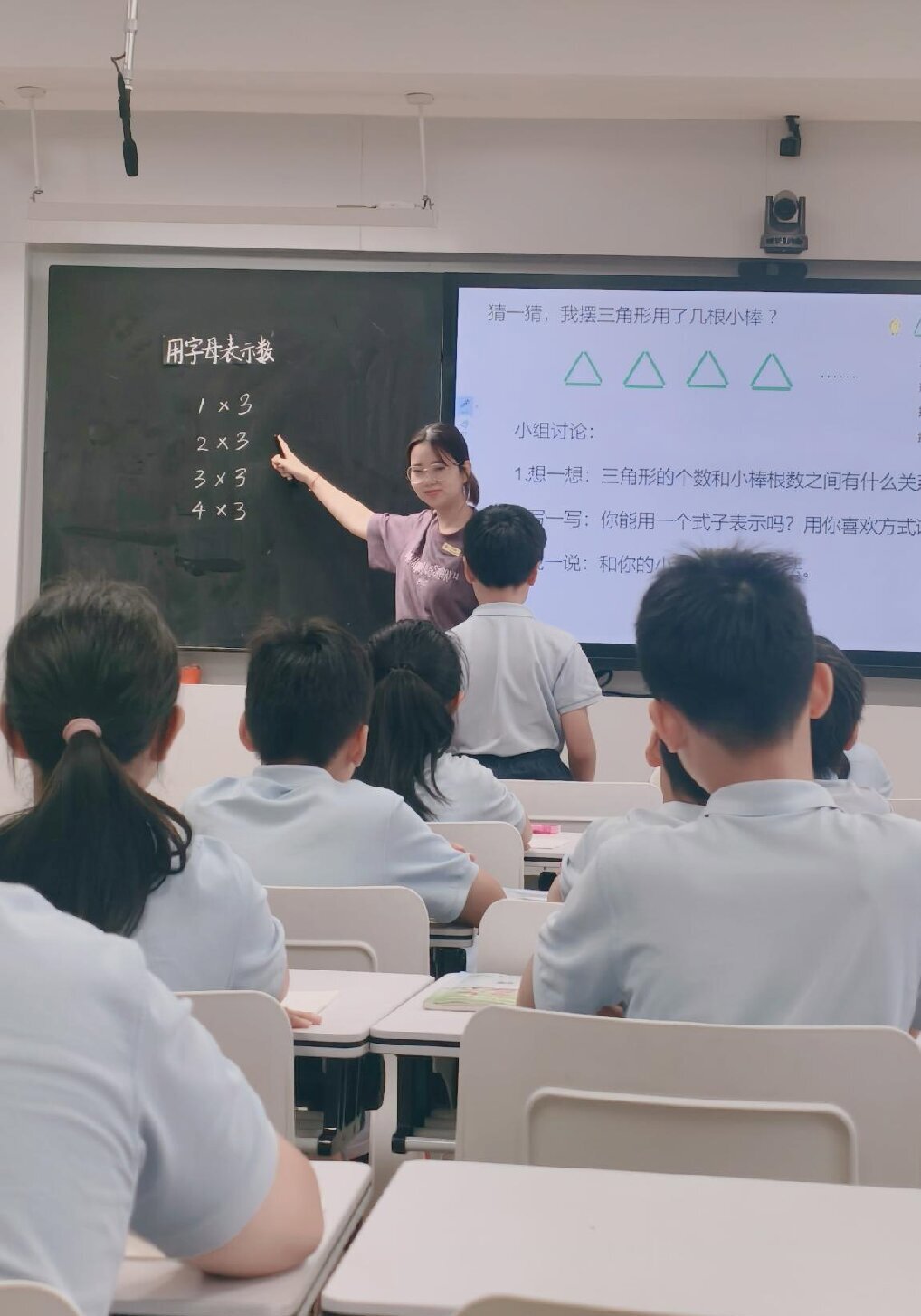 庾书婷老师通过用三角形摆小棒的例题,让学生初步感知字母表示特定数的意义庾老师引导发现 “摆 1 个三角形用 3 根,摆 n 个三角形用 3n 根”,逐步渗透字母表示可变数的内涵。整节课学生参与热情高涨,在活动中轻松掌握了 “用字母表示数” 的核心知识点。