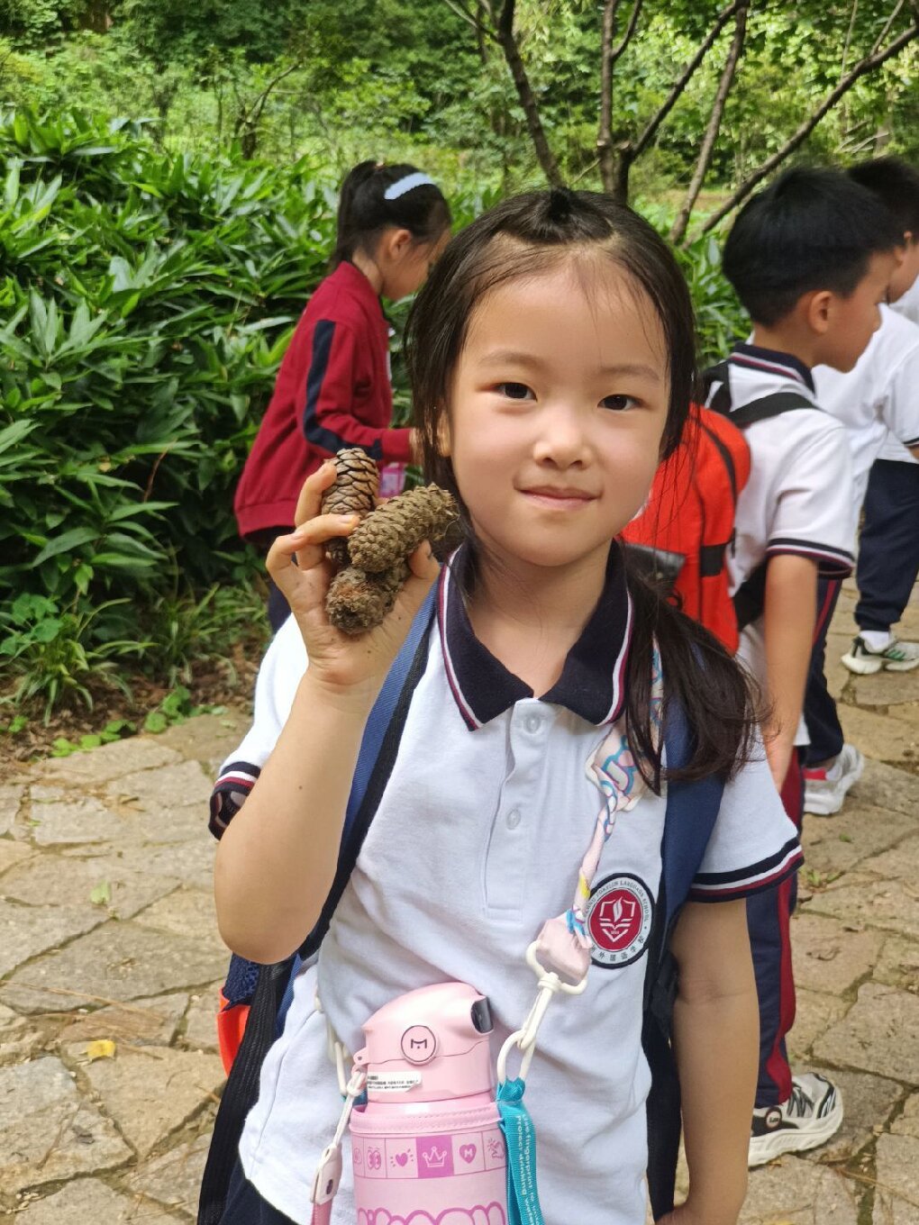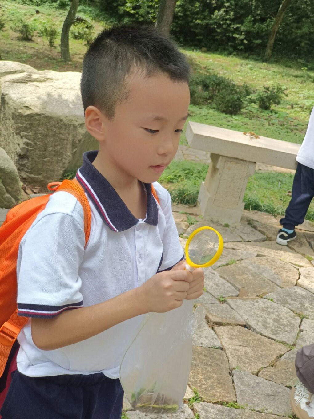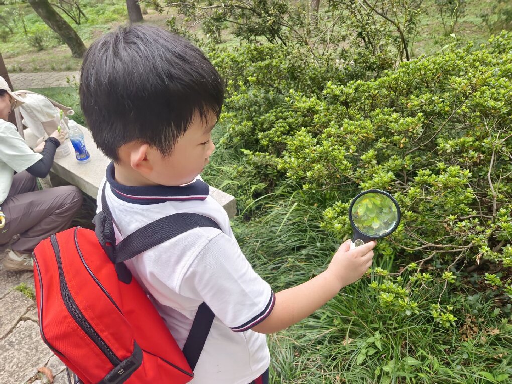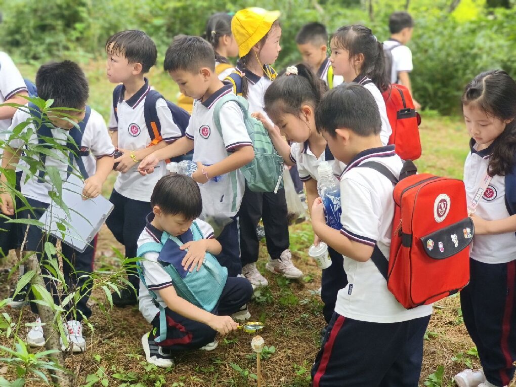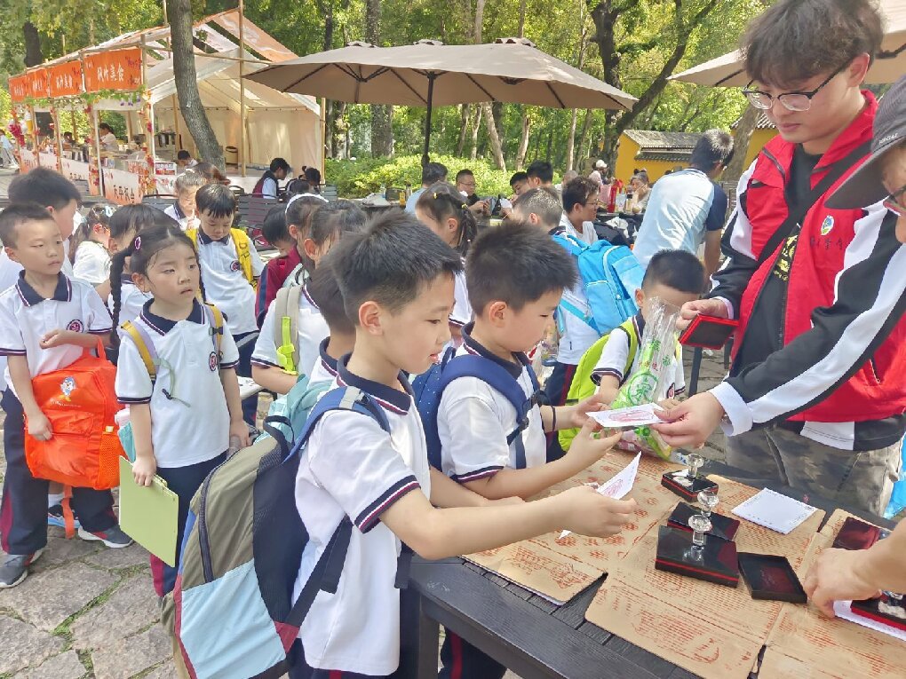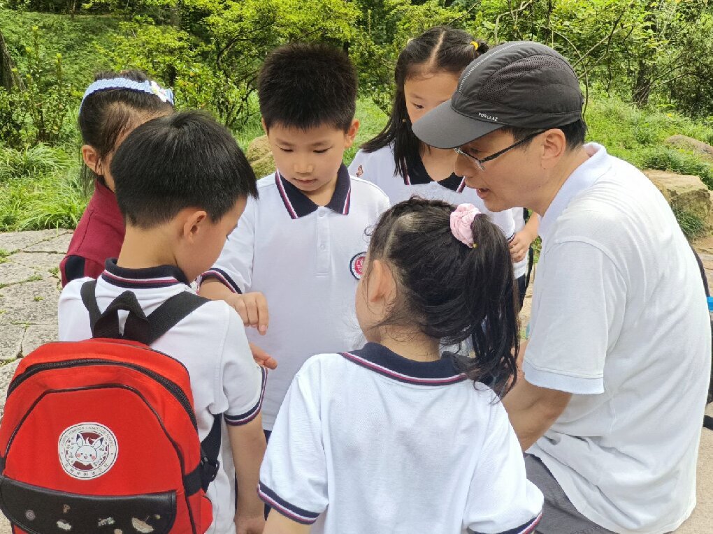 自然探索环节,孩子们化身“秋日侦探”,在铺满落叶的草地上开启了寻趣之旅。他们小心翼翼地拾起形态各异的叶片,有的像扇形的银杏、有的像掌状的梧桐、还有的像细针般的松针,红、黄、绿、橙等色彩更是让大家惊叹不已。在美术老师的指导下,同学们充分发挥想象力,将收集的落叶作为“天然颜料”,粘贴出小鹿、蝴蝶、小房子等创意十足的图案,让美术学科的创造力在自然素材中绽放。 同时,科学探索也同步展开。在科学老师的带领下,大家手持放大镜,仔细观察草丛中忙碌的蚂蚁、停在叶片上的蝴蝶,记录它们在秋季的生活习性,在观察与发现中感受科学学科的奇妙。印有天平山风景与字样的专属印章前,同学们有序排队,亲手为活动手册盖上独特印记,将这份秋日记忆“打包”珍藏。