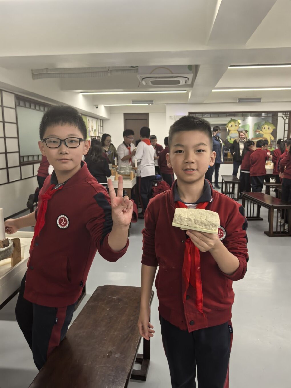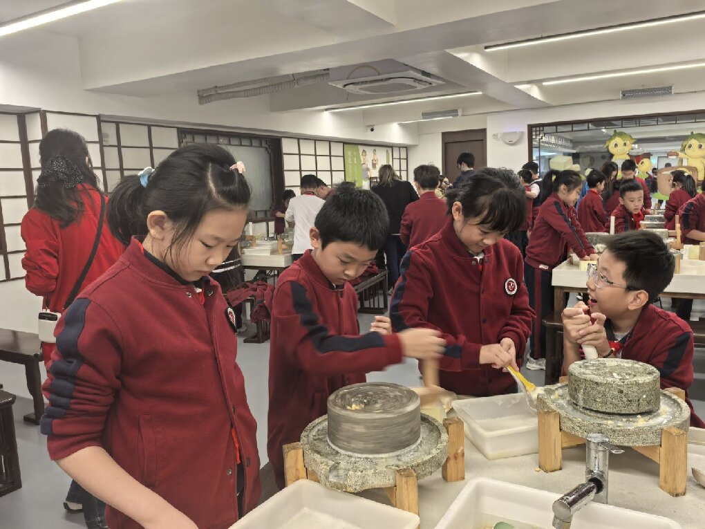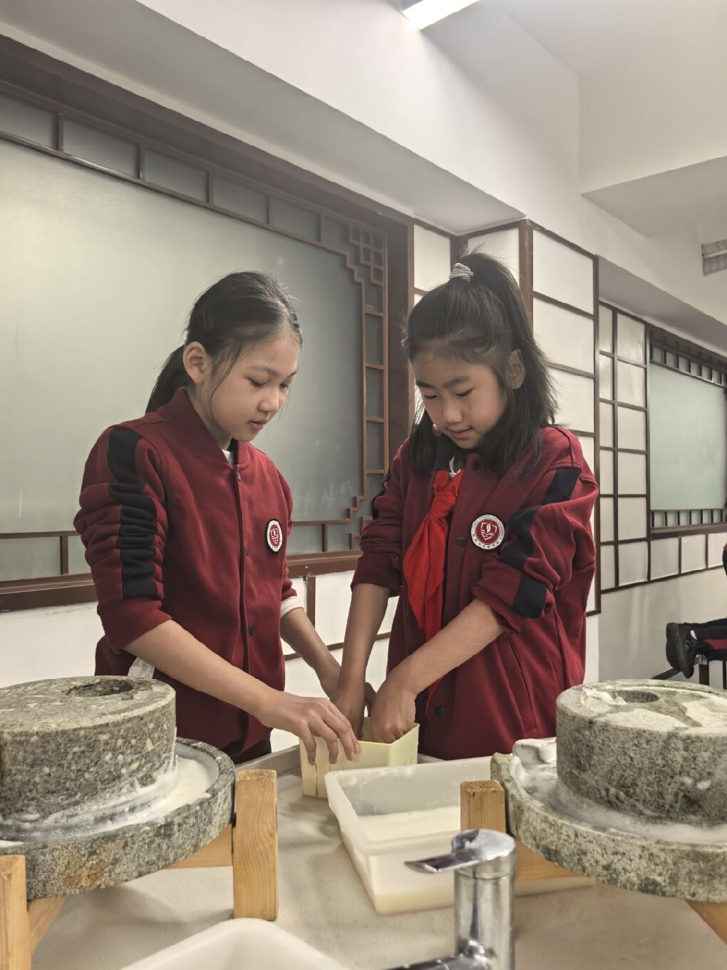 上午9点,体验教室里满是欢腾。在工厂师傅指导下,同学们分组操作,从舀取泡发黄豆、倒入特制小石磨,到亲手推磨出乳白豆浆,每一步都充满新鲜感。看到豆浆加凝固剂凝成豆腐脑,再压成小块豆腐时,大家难掩惊喜。