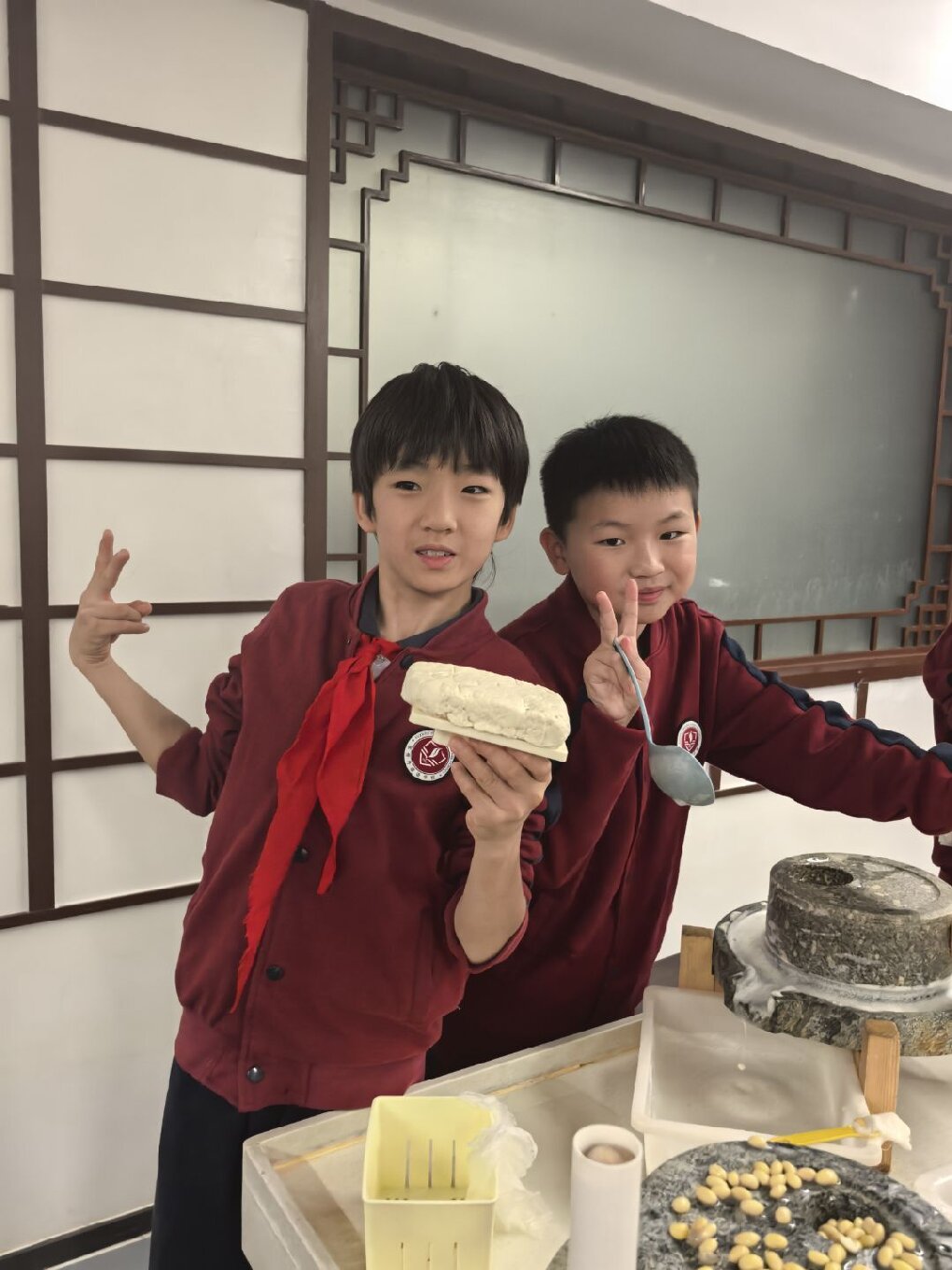有同学记录操作步骤,将科学课“物质变化”知识融入实践;有的主动帮动作慢的伙伴,尽显协作意识;还有人凑近闻着豆浆香,感慨“原来日常吃的豆腐,做起来这么不易”。这场体验不仅让大家掌握豆腐制作流程,更在动手中懂得 “劳动创造价值”。