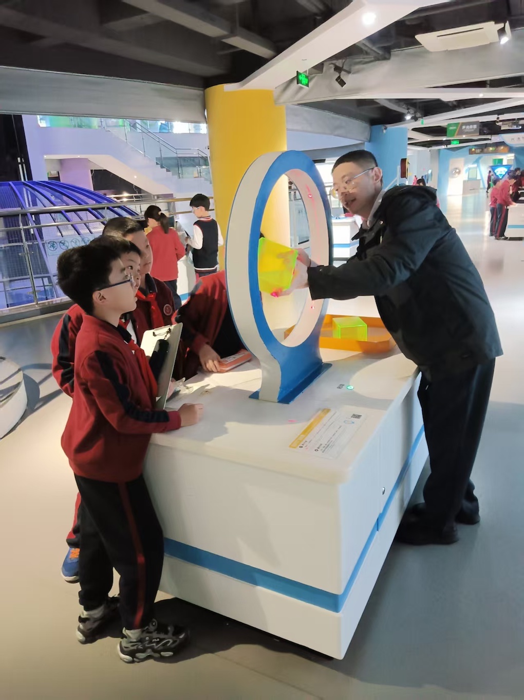 我们按参观路线依次参观各主题展区,一边体验项目的独特魅力,一边小组合作探索研究学科融合的项目作业。智慧绽放注重基础科学启蒙,通过 “镜子世界” 和 “声光体验” 等展项,让孩子在互动中直观理解物理原理。例如,在镜子迷宫中穿梭,感受光的反射奥秘。科技华光聚焦科学技术应用,设有 “电磁探秘” 和 “数学之魅” 等展区。参观者可以体验 “空气炮” 打靶,直观了解波的传导。未来展望展示前沿科技与未来生活,涵盖 “智能生活”、“能源材料” 及 “交通世界” 。在这里可以操作机器人,甚至进入1:1复刻的 “天宫一号” 舱内,按下按钮感受火箭发射的震撼。漫步姑苏独具苏州本地特色,将科技与江南文化相结合,提供沉浸式的本土科技文化体验。此外,馆内的动感4D和科幻球幕影院也交相辉映,能带来身临其境的沉浸式观影体验。