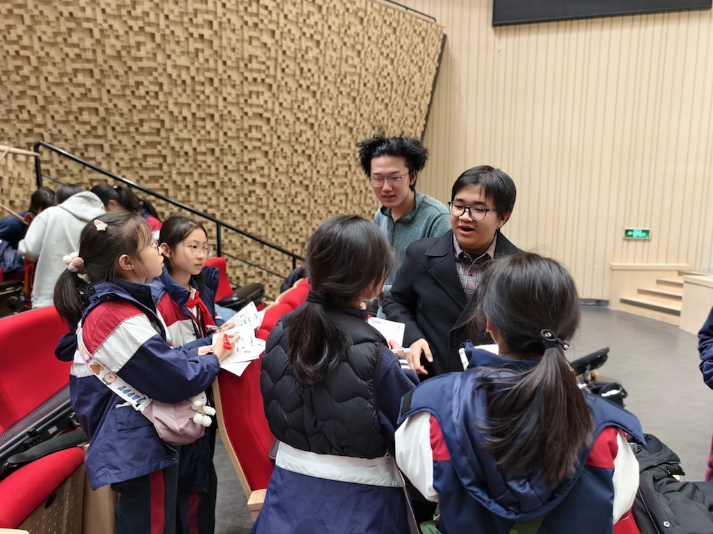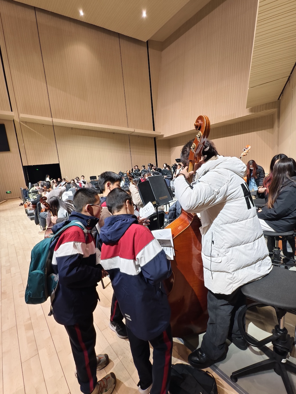 观摩之余,同学们手持“音乐护照”,主动上前与乐团成员交流。“低音提琴和大提琴在发声原理上有什么不同?”“长笛属于木管组,为什么是金属制作的?”……一个个充满探究精神的问题,展现了苏外学子出色的跨文化沟通能力与批判性思维。专业乐手们的细致解答,让课堂知识在真实的对话中得以深化。