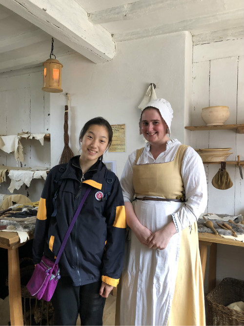 最后,我们排着队走进了Shakespeare’s Birthplace.房屋里面的物品大多数保留至今并保留着它的原样,1564年4月23日,莎士比亚出生在这座楼上二楼的主卧室,他的童年和青少年时代都是在这里度过的。发黄的窗玻璃上,还有他当时信手写下的文字。看着这些莎翁曾经的生活印记,我们仿佛穿越时空正与他对话。而此时在花园里,几位戏剧表演家正在演绎他的经典作品片段,学生们看得津津有味!