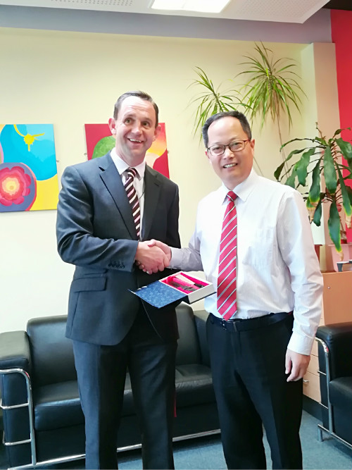 2018年5月22日上午,天气晴朗,董校长和周园长来到Thomas Deacon Academy学校看我们。
