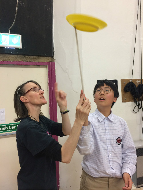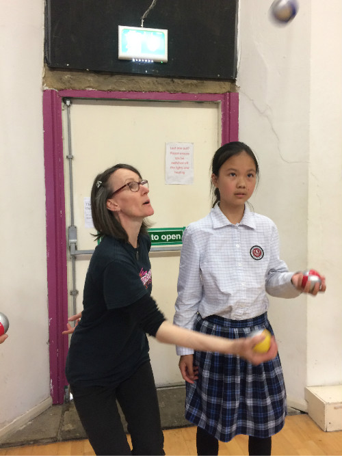 周一,我们一大早就迫不及待来到了谢菲尔德马戏团工作坊,学习马戏趣味技能。老师教我们的第一项技能便是踩高跷,只见马戏老师踩着几十公分的高跷来去自如,行走如风,孩子们都按捺不住想试试。这不,陈淳郁在王苡亮的帮助下试着登高跷,她双手扶在高跷上,一只脚先小心翼翼地踩上去,再将另一只脚往上踩,可踩上去大概才一秒,脚一歪,人又从上面掉下来,简直太有趣了!听马戏团老师讲解了诀窍以后,大家都跃跃欲试,在小伙伴的互相帮助下,没过一会儿,陈淳郁和陈睿仪就走的很快啦!之后,大家还学会了骑独轮车,抖空竹和隔空转盘。连马戏团老师都笑称,我们可以去摆摊卖艺啦!与同学们一起玩杂耍,既新奇又快乐,那一声声欢笑,一次次喝彩,将成为他们英国之行难忘的记忆。