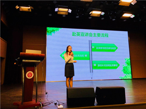 宣讲会伊始,几个刚刚修学回来的学生代表作了精彩的修学经历分享。他们采用小组合作交流的方式,运用了大量的图片、数据、文字,中文英文随意切换,娓娓聊起了在英修学三个月的生活、学习和活动。