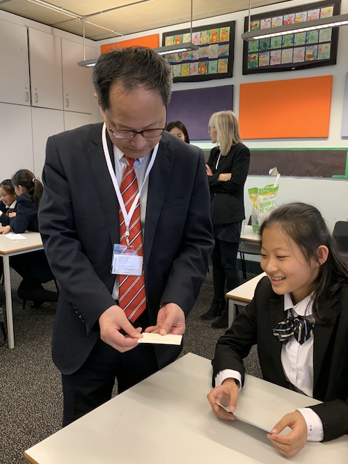 “董校长的脸上洋溢着慈父的魅力。他带来了我们在中国的同学给我们的视频,看着荧幕上那一个个熟悉的脸庞,一串串充溢着孩童的纯真的笑容,我的心中勾起了一片片记忆碎片,在记忆深处回荡......好想在这在此时此刻和他们在一起再疯几次。当熟悉亲切的老师们再一次出现在我们眼前,送上最最最美丽的话语时,我的泪水夺眶而出。我想你们了,亲爱的老师!当然还有我们的家人的来信。信中写满家人对我们的牵挂,担心,和祝福。眼泪在每个人的眼角打转,浸润了眼眶,流下最真挚的泪水......董校长还为我们每人准备了他喜欢吃的巧克力,这可是大家都羡慕的‘别人家的校长’呦!Principal Dong and some school leaders have brought us videos from our classmates in China. Looking at the smiling faces on the screen, my heart was beating fast and touched. When our dear teachers appeared in the video again, we couldn’t help busting into tears. Of course, there were letters from our parents, who have been missing us all the time. Mr. Dong also prepared chocolate for each one of us. We are all very happy and thankful for Mr. Dong's coming to visit us.”