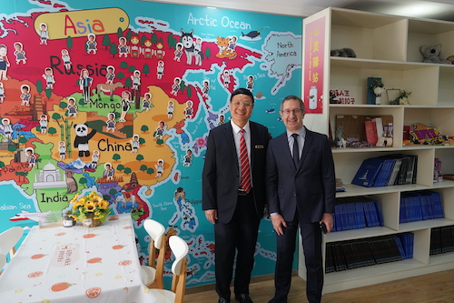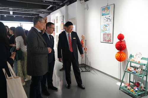 苏外校领导及法语组的老师们,带领着法国的师生们参观苏外校园:走进艺展中心,为法国师生介绍了龙年的作品展,走进小学部的多语种班级,认真观察中法校园的不同之处。