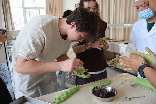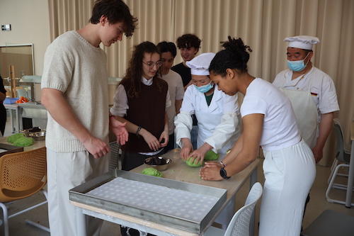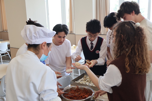 来了苏州怎能不一尝江南特色的青团?学校食堂里,在厨师的指导下,他们亲手制作软糯的青团和形状各异的饺子。揉面、包馅、蒸制...大家兴致勃勃地体验着中国饮食文化的魅力,并一起品尝自己的劳动成果。