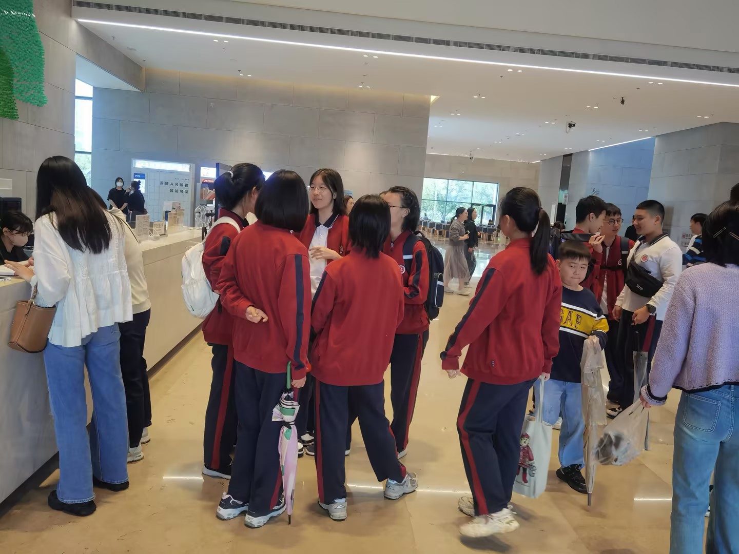 苏州博物馆西馆位于长江路399号,建筑面积达48365平方米,展陈面积13391平方米,自2021年建成以来,已成为苏州文化的新地标。与苏州博物馆本馆相比,西馆不仅面积更大,而且建筑更具现代感,内部设计巧妙融合了传统苏州园林的精髓,展现了古典与现代的和谐统一。进入博物馆后,师生们首先被西馆宽敞的大厅和精致的装修风格所吸引。大家在门口排队领取了参观票,并在班主任贾老师的带领下,有序地开始参观。