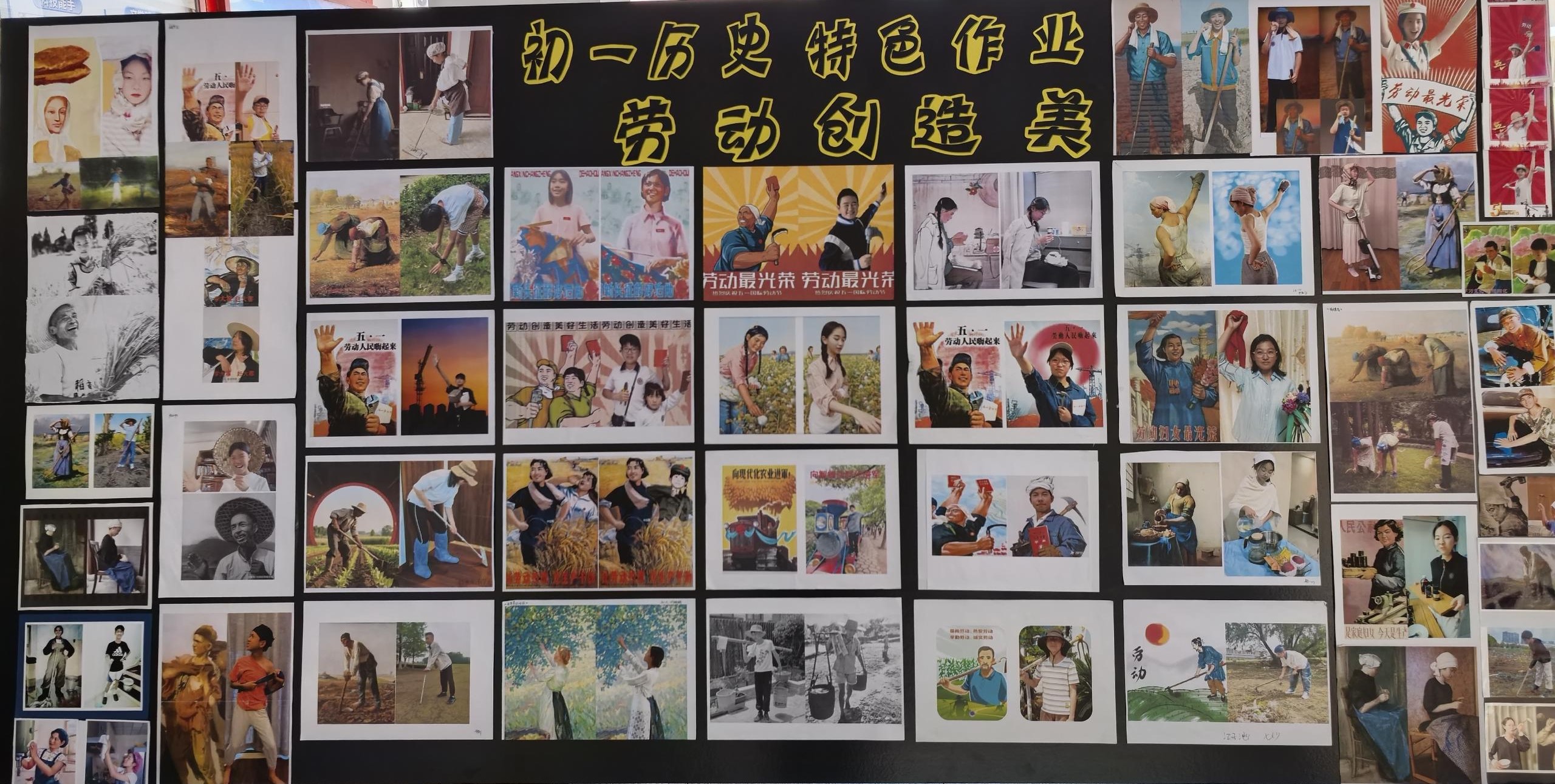 在 “初一历史特色作业劳动创造美” 的展板间,时光仿佛在此交织重叠。学生们以灵动的姿态模仿历史照片中的经典动作,现代的服饰与历史的场景相互映衬,构成了一幅奇妙的古今对照图。看,那模仿农人耕作的身影,虽无岁月的沧桑,却有着对劳动精神的生动诠释;那复刻历史画面的姿态,每一个细节都在诉说着劳动创造美的永恒真理。劳动让人民在历史长河中挥汗耕耘,今日少年以青春活力致敬传承,劳动的光辉在不同时代同样闪耀,从未褪色。这一方展板,不仅是画面的展示,更是精神的延续,让我们看见劳动精神在时光中代代相传的坚韧与美好。