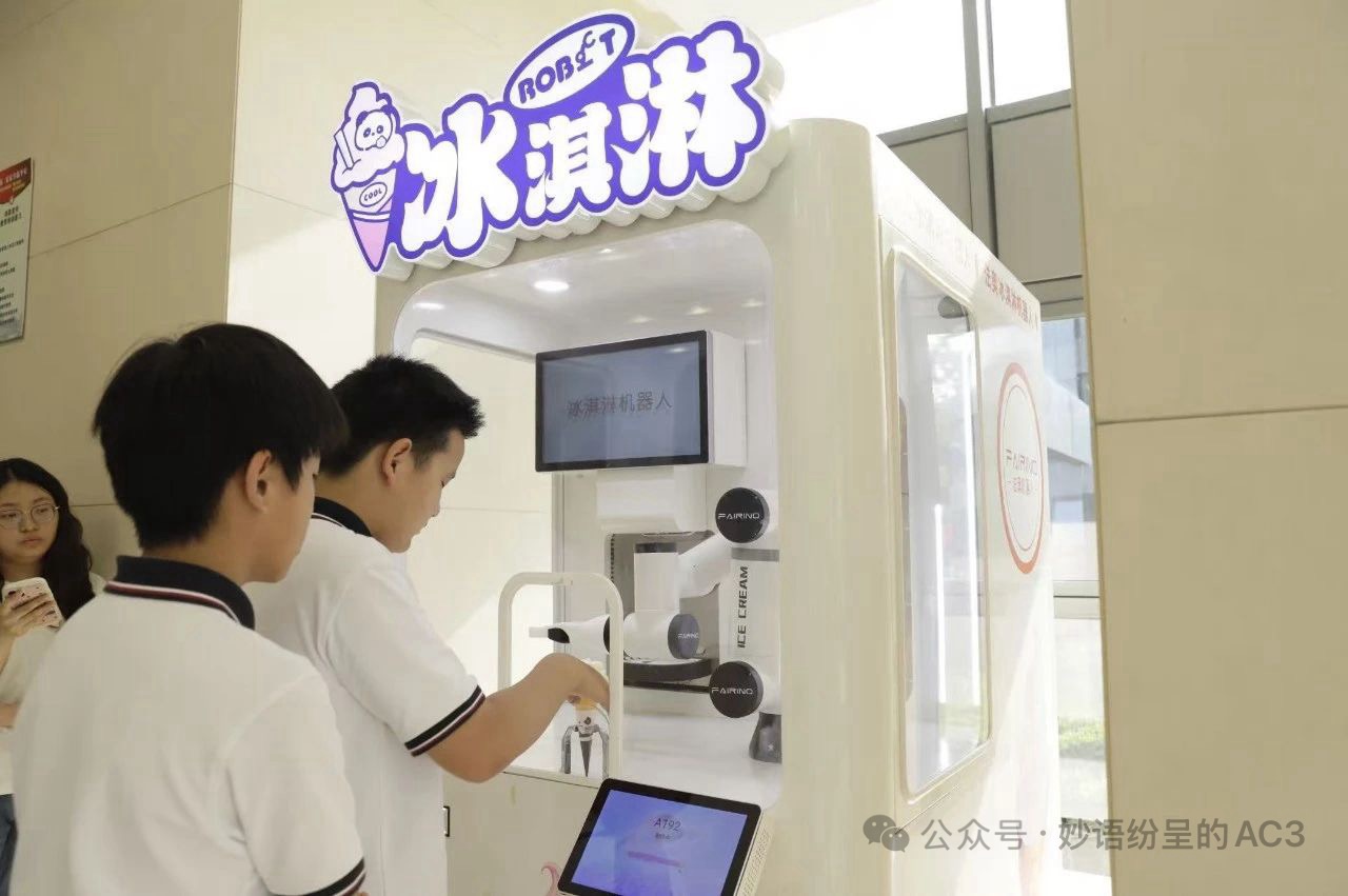 引发大家欢呼的当属冰淇淋机器人互动体验,法奥冰淇淋机器人可以毫米级精度控制奶油挤出量完成冰淇淋制作。同学们在品尝美味的同时,更直观感受到协作机器人在柔性操作、人机交互上的技术魅力。