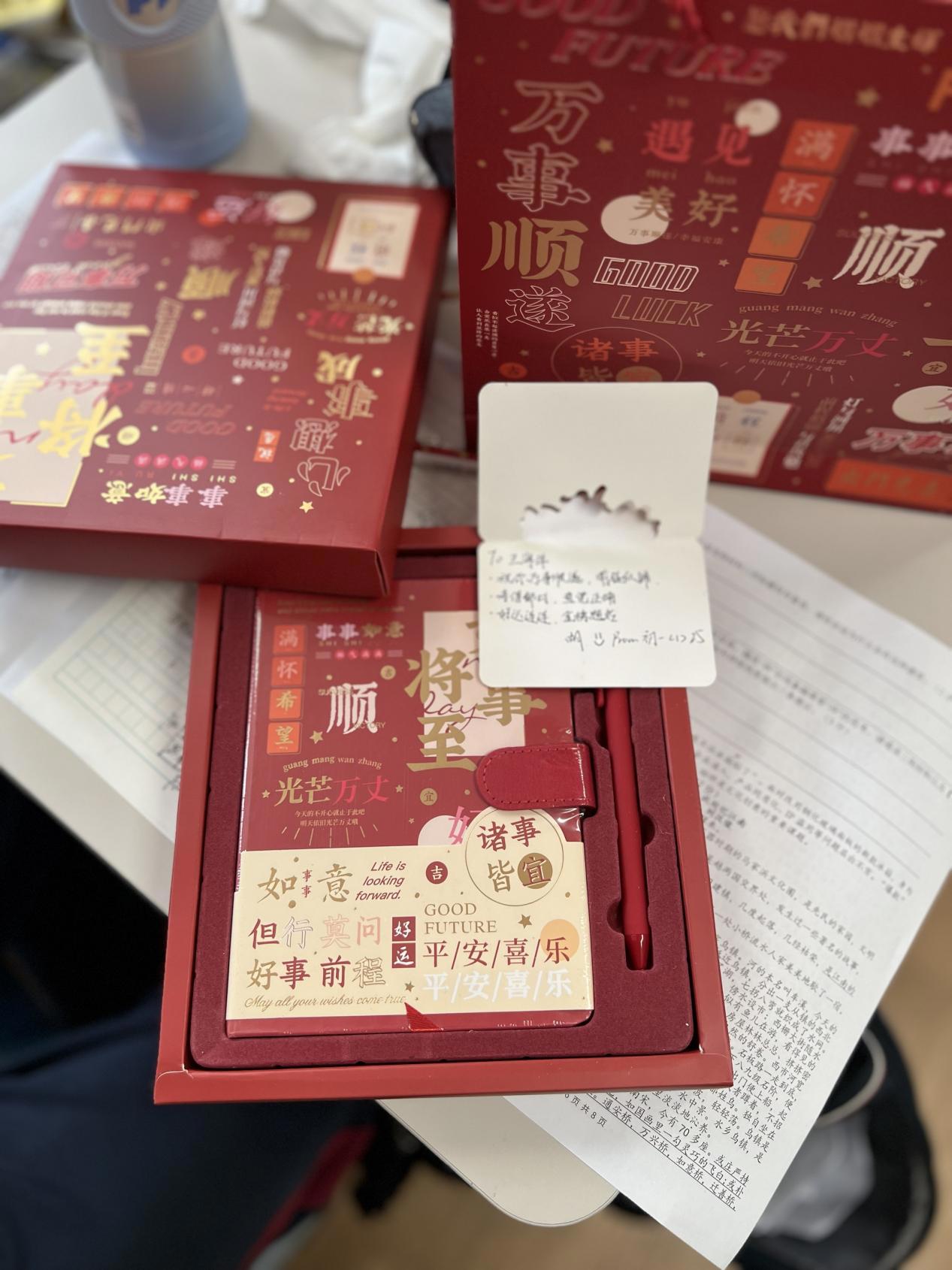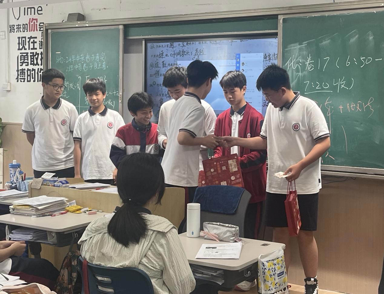 教育是一场温暖的接力,“中考不是终点,而是通往星辰大海的第一站。”初三(1)班班主任董老师在赠礼时动情说道,“这份祝福既是致敬奋斗者,也是播种追光梦——今日你们执笔为剑的身影,正在初一学生心中种下勇毅的种子。”