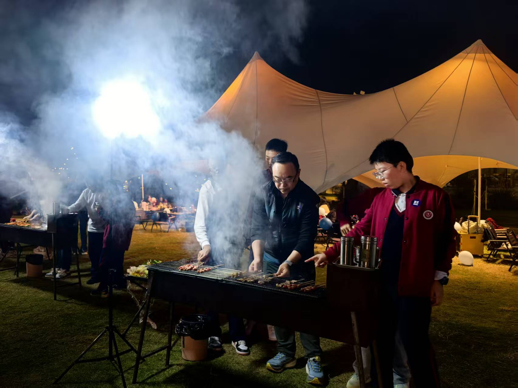 暮色渐起,烧烤区炊烟袅袅,温情也随之升腾。家长们悉心烤制食物,孩子们主动传递调料、整理餐具,在炊烟与香气中,劳动成为亲情的纽带。音乐响起,多位家长即兴献唱,孩子们轻声跟和,歌声与笑语交织,勾勒出一幅家校共融、亲情流动的秋日画卷。
