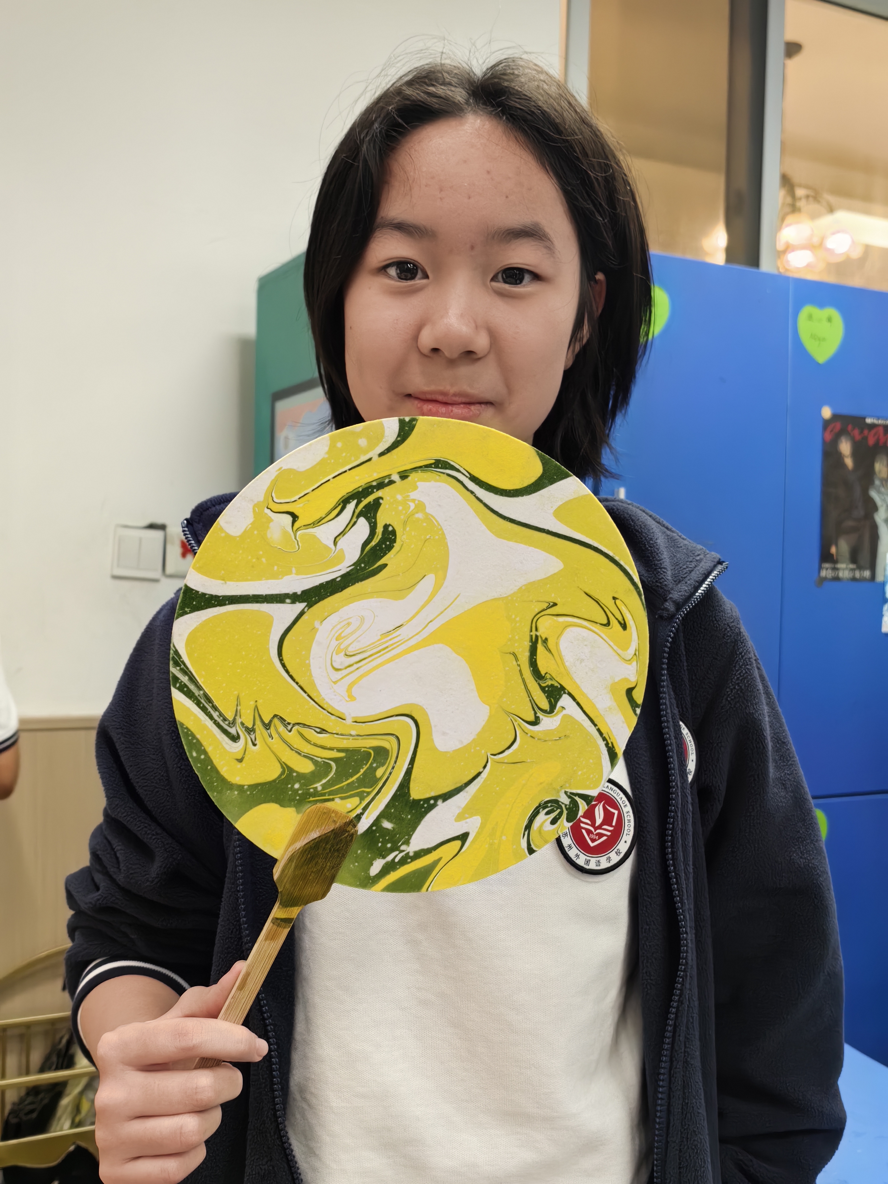 此外,学生们还体验了古老的非遗技艺——水拓画。当颜料在水面舒展、绽放,经纸拓印形成独一无二的纹理时,学生们在动静之间,直观地感受到了色彩流动、交融的随机之美与创造之乐,对中国传统色彩的运用有了更深刻的体悟。